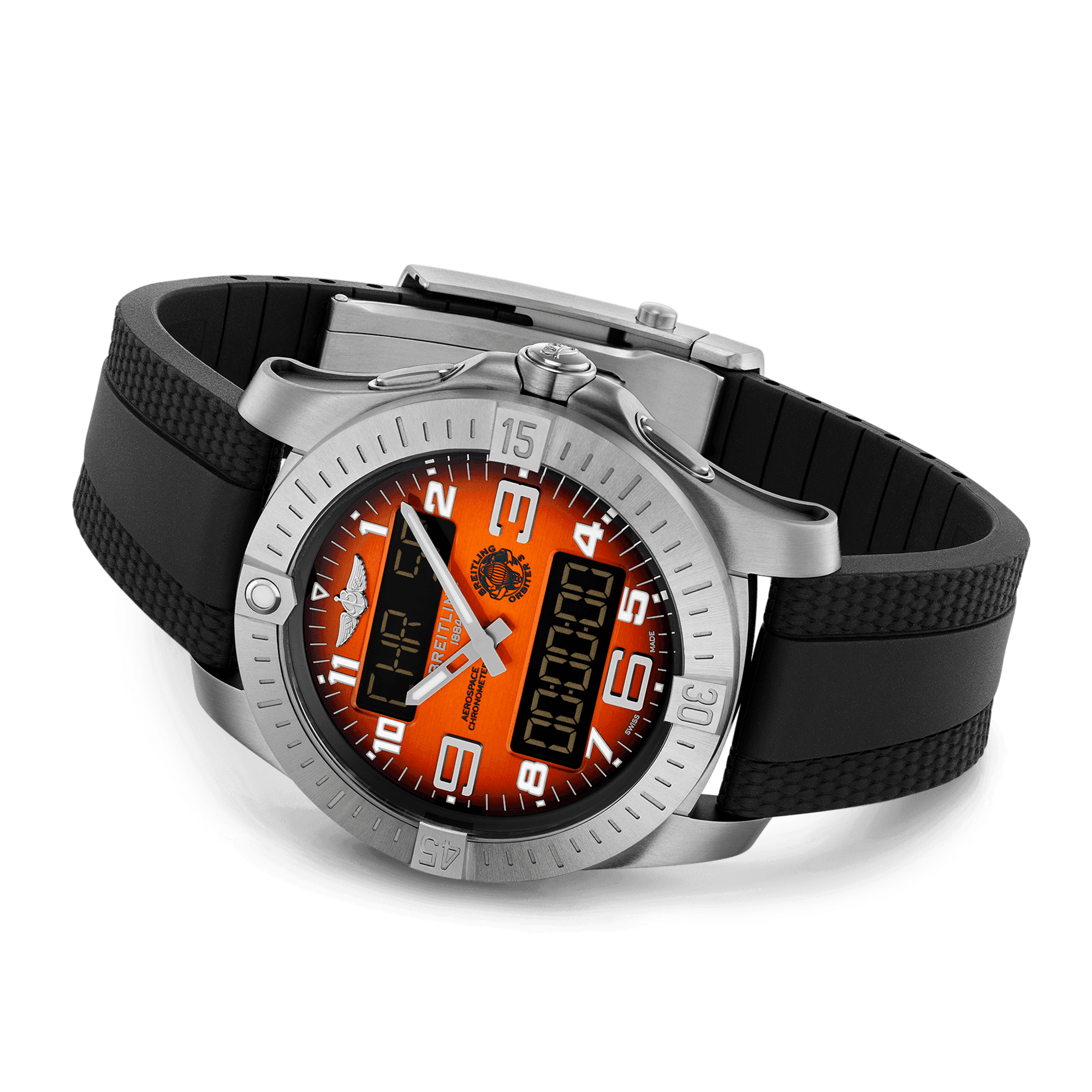 Breitling Aerospace Orbiter Edition 43mm Titanium Men's Strap Watch EB70101A1O1S1. Titanium 43mm case and bezel all on a black rubber strap. This special edition men's watch features a orange gradient dial with polished and luminous applied hands and hour markers. Sapphire crystal glass and water resistant up to 100m. Special caseback with part of the Orbiter balloon displayed. B70 SuperQuartz movement.