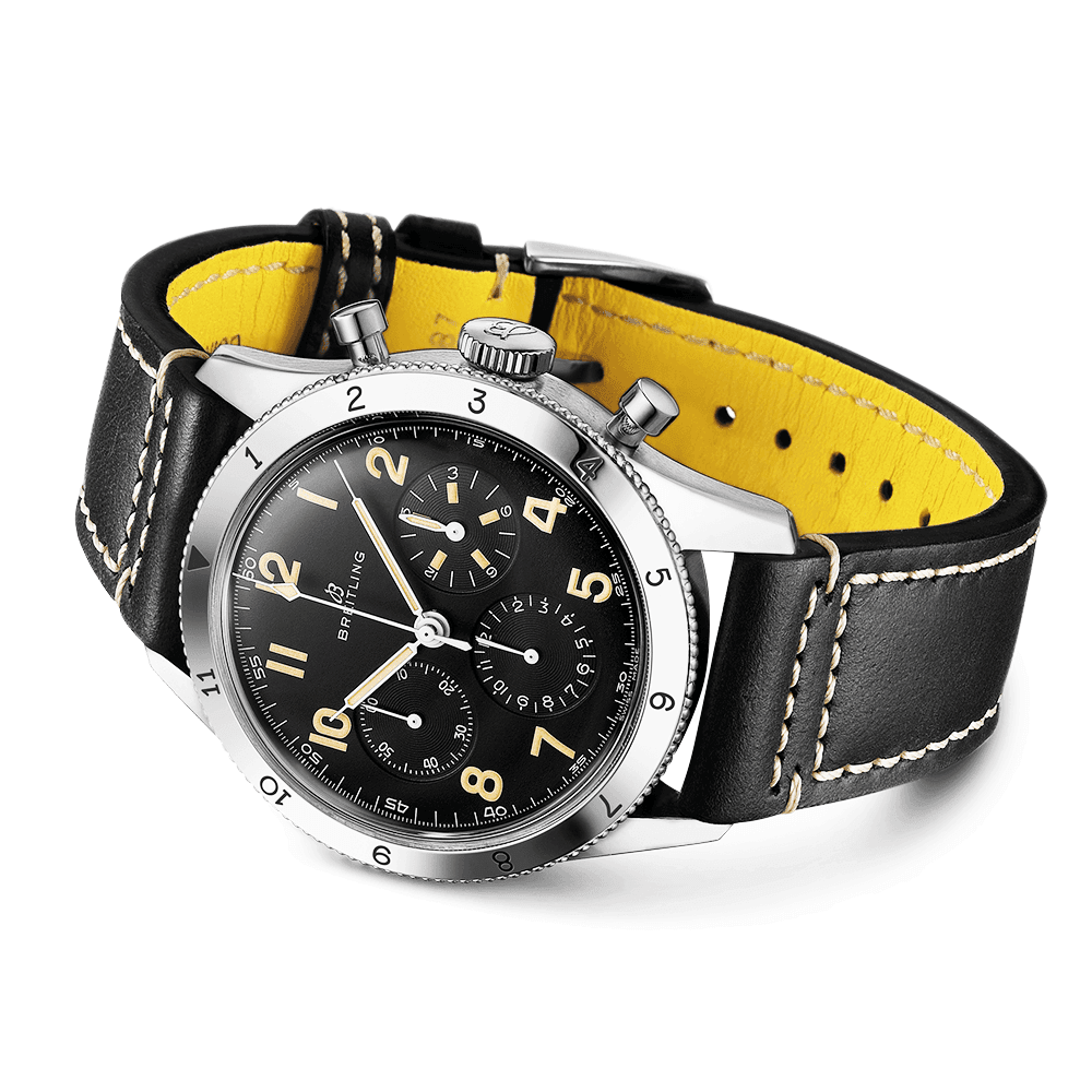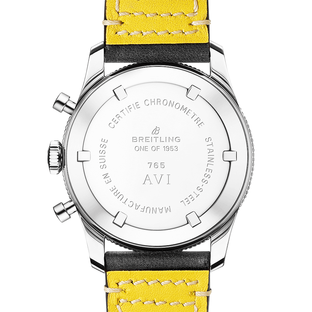 The Breitling Aviator AVI Ref, 765 from the Aviator collection is a reinterpretation of an earlier model, the Co-Pilot Ref. 765 AVI, which sat alongside the Navitimer watch with its bold legible design and its functional engraved rotating bezel. The timepiece echoes the same Arabic numerals and chronograph layout as the original Co-Pilot watch and Features a 41mm stainless steel, along with luminous coated hands that replicate the look of the luminescent material used in the original. An improved water resistant case of 30 meters and the absence of the “GENEVE” lettering are the only two main differences between the 41mm Breitling AVI Ref, 765 and its former model. The black dial provides legible functions such as the small seconds, 12-hour and 30-minute Features courtesy of the Breitling B09 movement. This mechanical hand-wound movement offers a 70-hour power reserve and performs at a rate of 28,800 vibrations per hour. The Breitling Aviator 8 41mm AVI Ref. 765 1953, which is limited to just 1953 pieces worldwide, is fitted with a classic black leather band adorned with off-white contrast stitching down the sides and a stainless steel buckle.