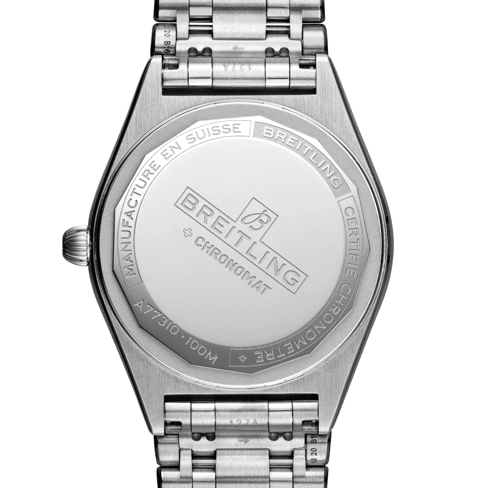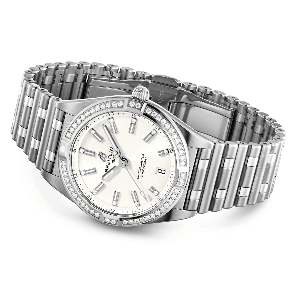 Dressed in crisp white tones and lustrous stainless steel shades, this robust Breitling watch for ladies combines a sporty-chic aesthetic with unbeatable accuracy. Its SuperQuartz thermocompensated quartz electronic movement is secured safely inside a 100-meter water resistant steel case. It sits behind a striking white legible dial. The quartz movement guarantees an accuracy that is ten times greater than that of a standard quartz watch. In addition to its superior performance, the lady’s Breitling Chronomat 32 is adorned in scintillating diamonds set onto its bezel. Adding a touch of luxury and glamour to the wrist, the lady can wear this sporty, confident timepiece to all those special occasions. This Breitling Chronomat 32 watch also Features diamond dot indexes combined with baton markers around the hour track. The batons are coated in Breitling’s Super-LumiNova technology, as are the central hour and minute hands. As well as a screw-down crown and sealed caseback, the watch also Features a unidirectional rotating bezel complete with the instantly recognisable rider tabs for an easy grip. The Breitling ladies watch is completed on a stainless steel integrated Rouleaux bracelet with a folding clasp – a signature design code of the Swiss brand’s iconic Chronomat series.