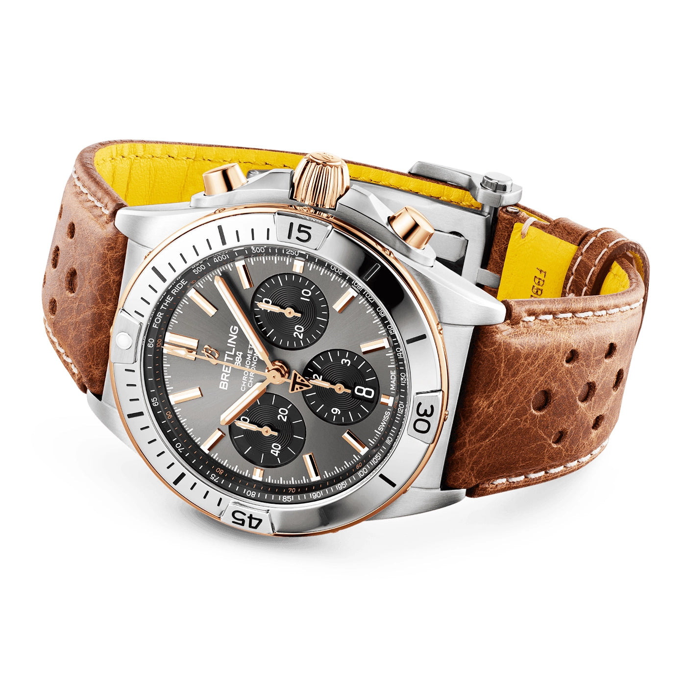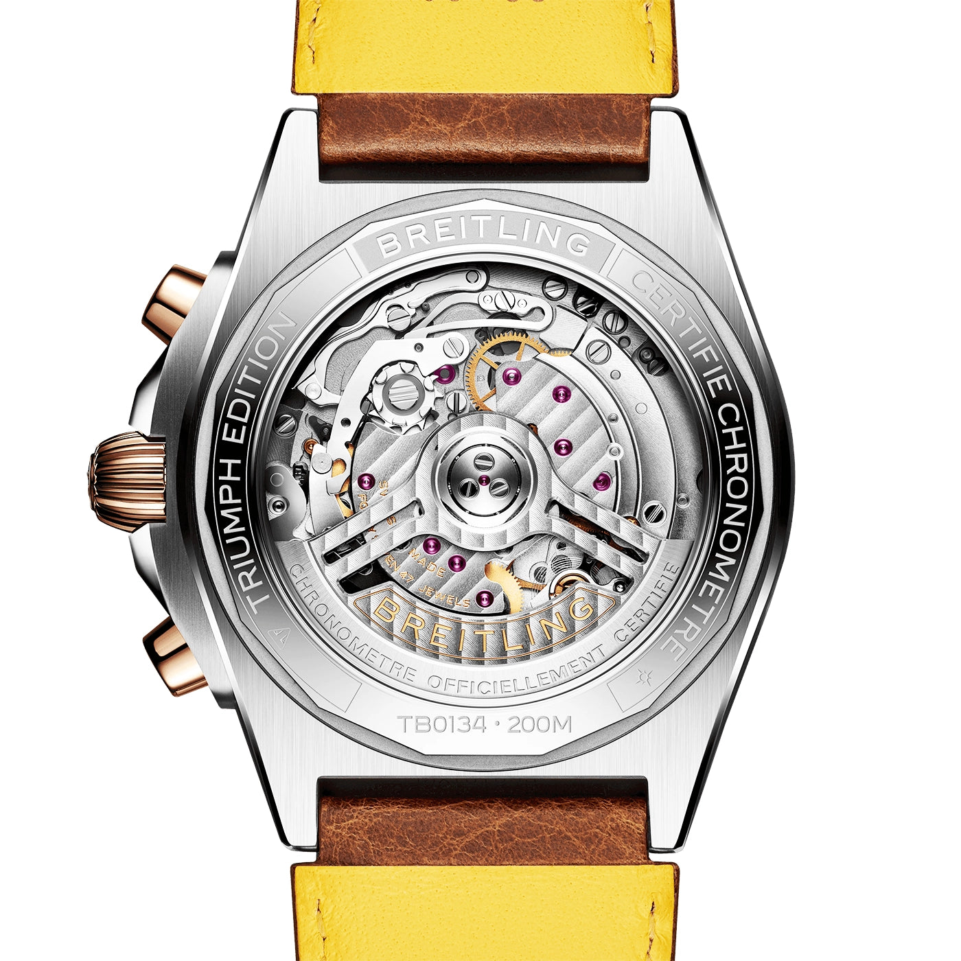 Breitling Chronomat B01 42mm Triumph Edition Automatic Chronograph WatchTB0134101M1X1. Titanium & 18ct red gold 42mm case and bezel all on a brown leather strap. This men's watch has a grey sunray dial with rose golden hands and luminous applied hands and hour markers, contrasting black sub counters with date display at the 6 o'clock position. Sapphire crystal glass and water resistant up to 200m. Automatic chronograph movement.