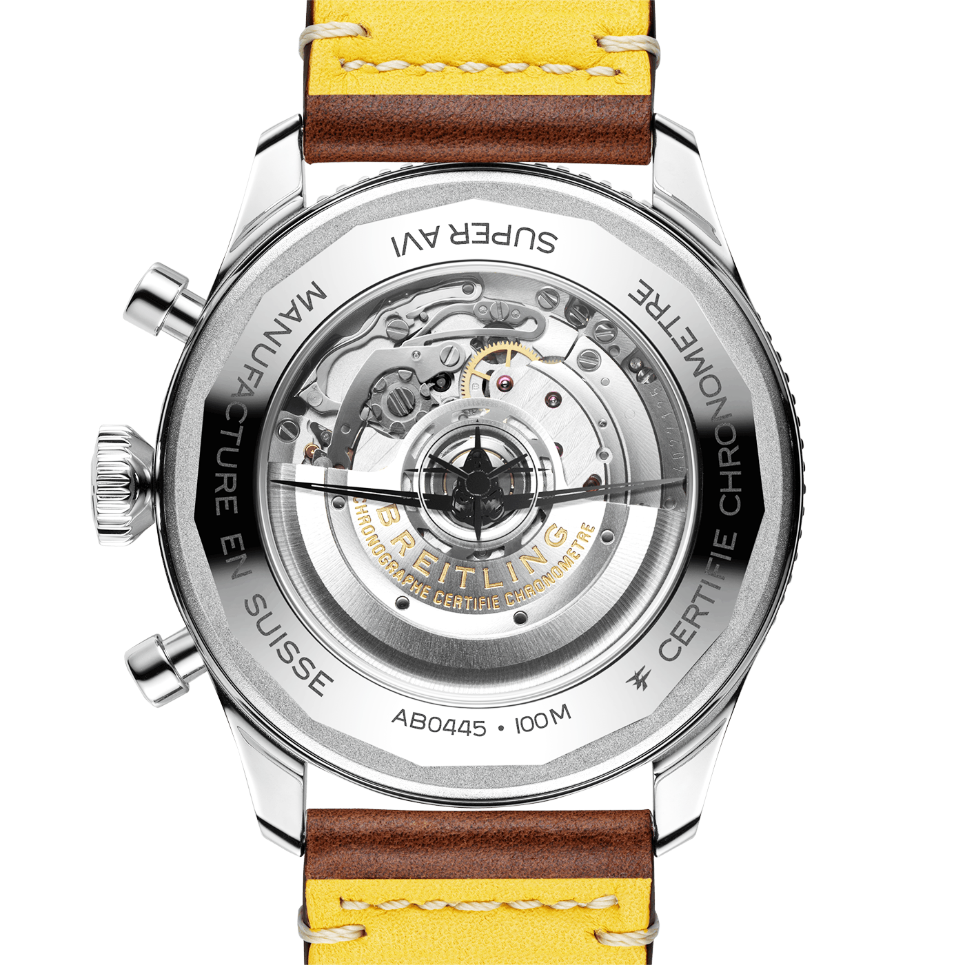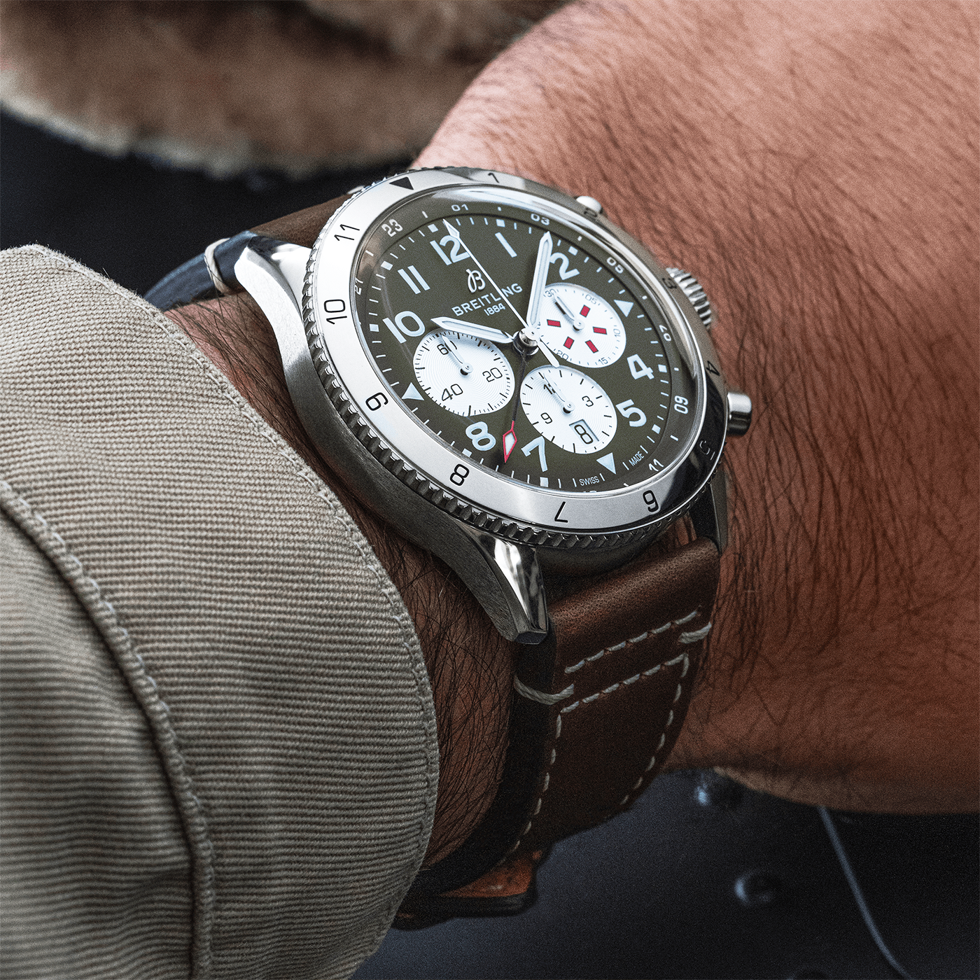 Breitling Super AVI Curtiss Warhawk GMT 46mm Green Dial Chronograph Watch AB04452A1L1X1. Stainless steel 46mm case and polished bezel all on a brown leather strap. This men's watch has a green dial with contrasting silver chronograph sub counters with a date display at the 6 o'clock position. Special editionsapphire crystalcaseback. Water resistant up to 100m and sapphire crystal glass. Power reserve up to 70 hours. Automatic chronograph movement.