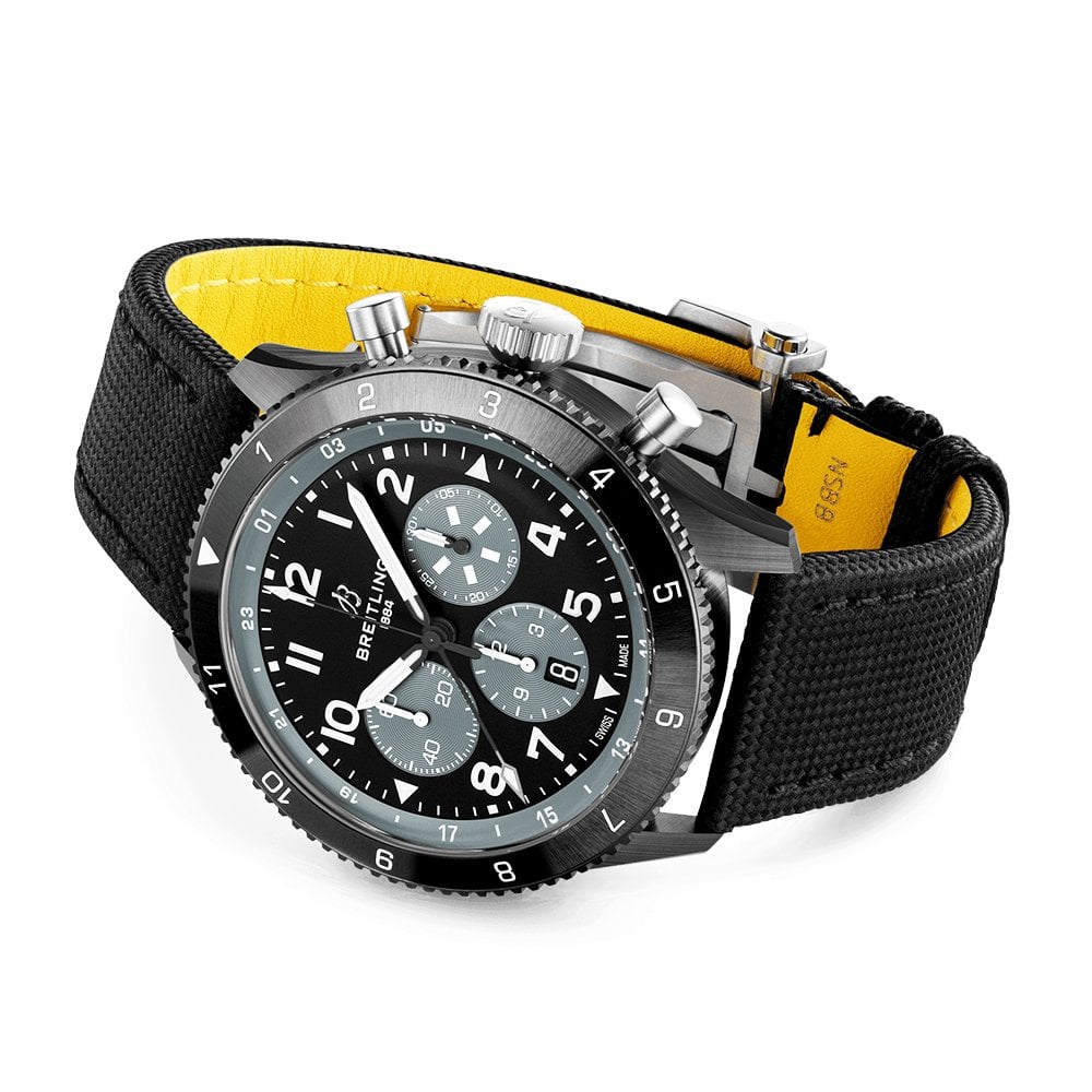 BreitlingSuper AVI Mosquito Night Fighter 46mm Black Dial Chronograph Watch SB04451A1B1X1. Black ceramic 46mm case and polished ceramic bezel all on a black fabric strap. This men's watch has a black dial with stealthy grey chronograph sub counters. Special edition exhibition caseback. Water resistant up to 100m and sapphire crystal glass. Power reserve up to 70 hours. Automatic chronograph movement.