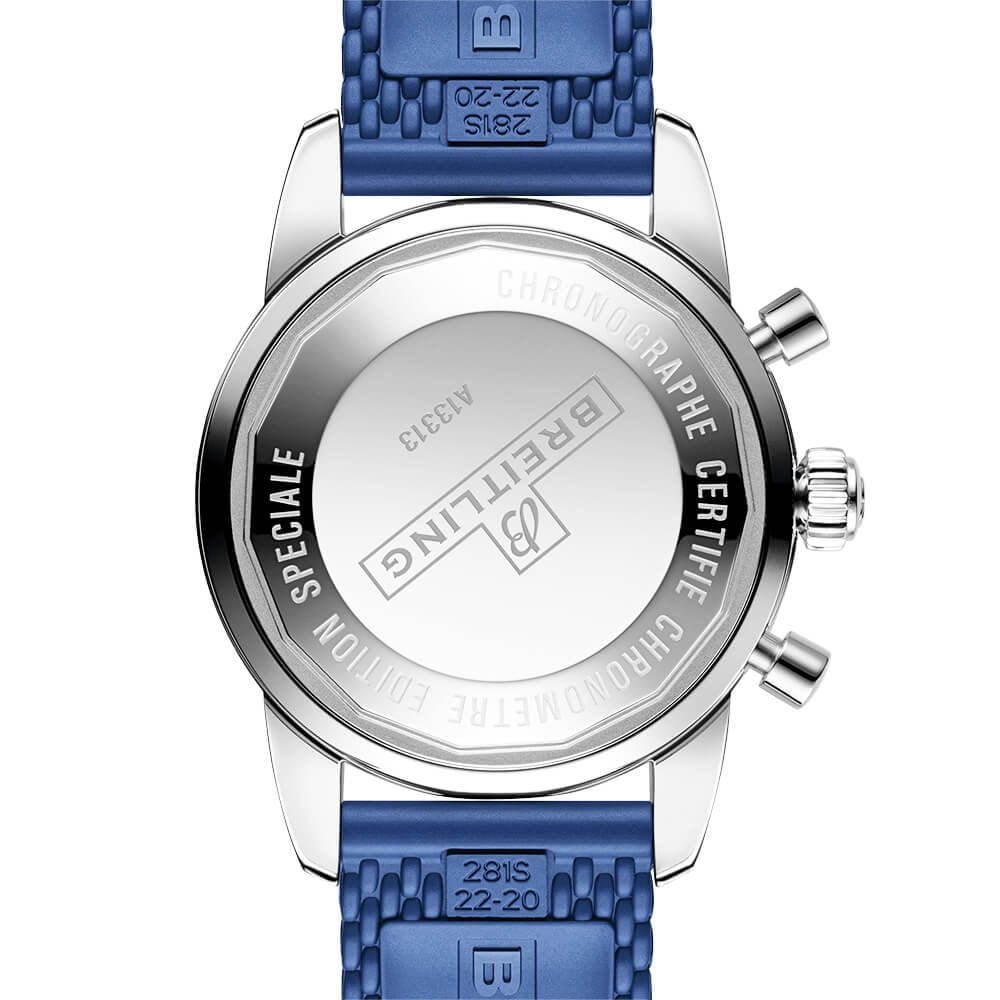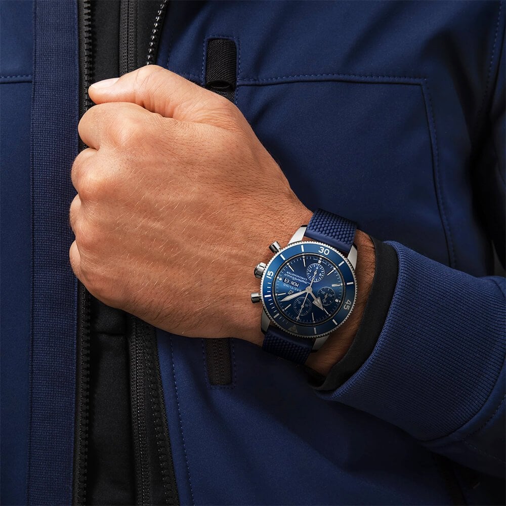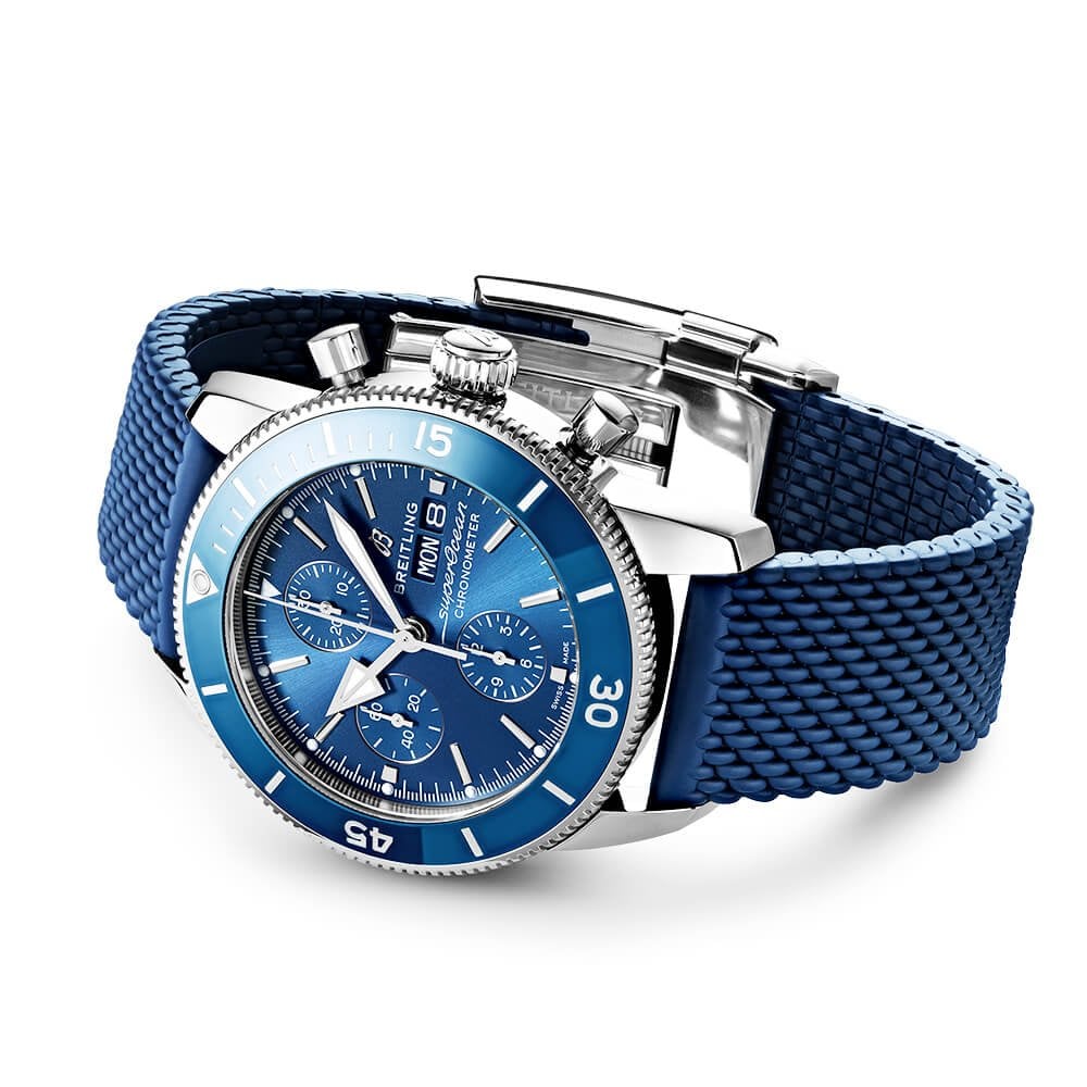 Breitling Superocean Heritage II 44mm Blue Dial Day/Date Rubber Strap WatchA13313161C1S1. Stainless steel 44mm case and blue ceramic bezel all on a blue rubber strap. This men's watch has a sunray blue dial with polished hands and hour indexes as well as a day/date display at the 3 o'clock position. Water resistant up to 200m and sapphire crystal glass. Automatic movement.