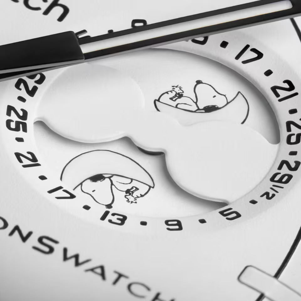 Under UV light, a hidden quote from a Snoopy comic strip emerges among crescent moons and stars on a unique subdial. Each dial proudly displays the OMEGA X Swatch branding, alongside the iconic Speedmaster logo and the MoonSwatch emblem.