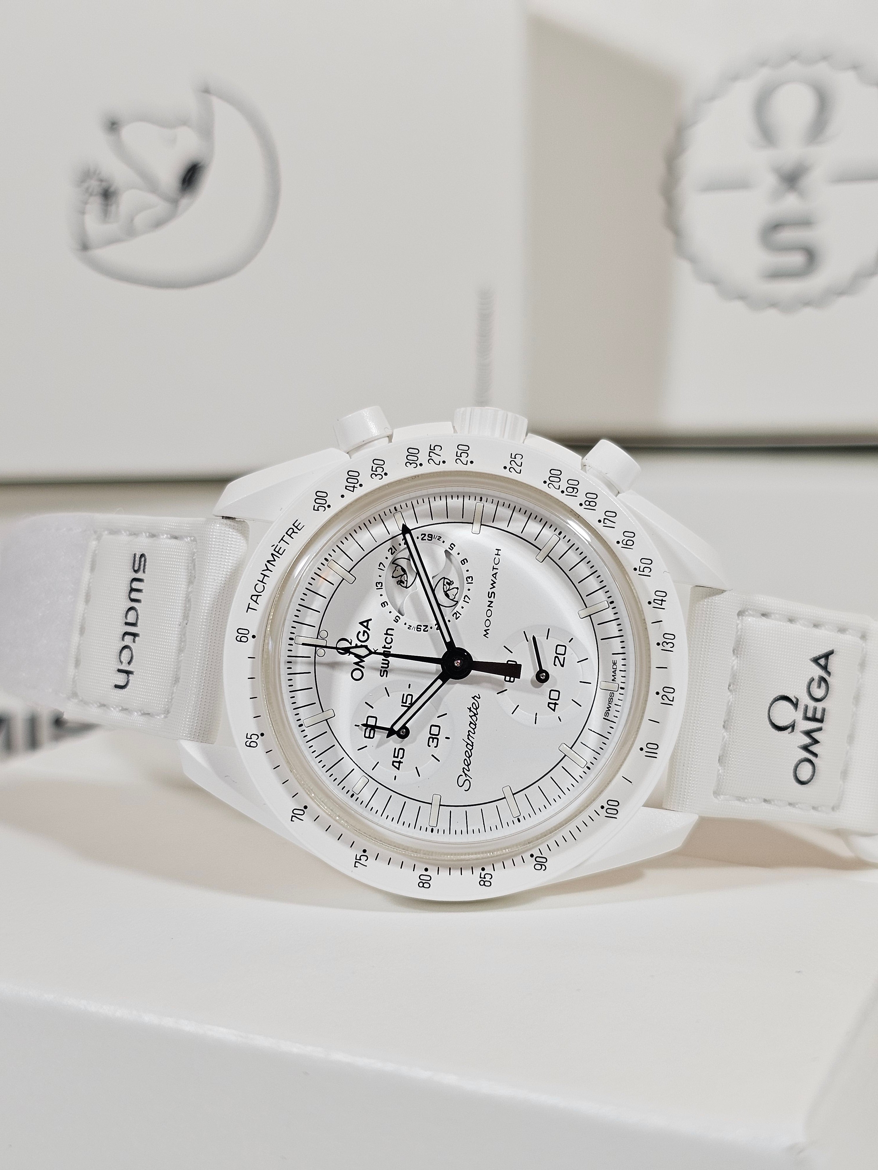 Released 26.03.24 the Mission to the MoonPhase timepiece, inspired by the celestial beauty of the full moon. With an elegant all white colour palette, this model exudes sophistication. Crafted with a Bio ceramic case, crown, and pushers, complemented by a durable VELCRO strap, it merges style with resilience. The chronograph's seconds hand, sub dial hands, and tachymeter-scaled bezel are strikingly contrasted in black against the white backdrop.