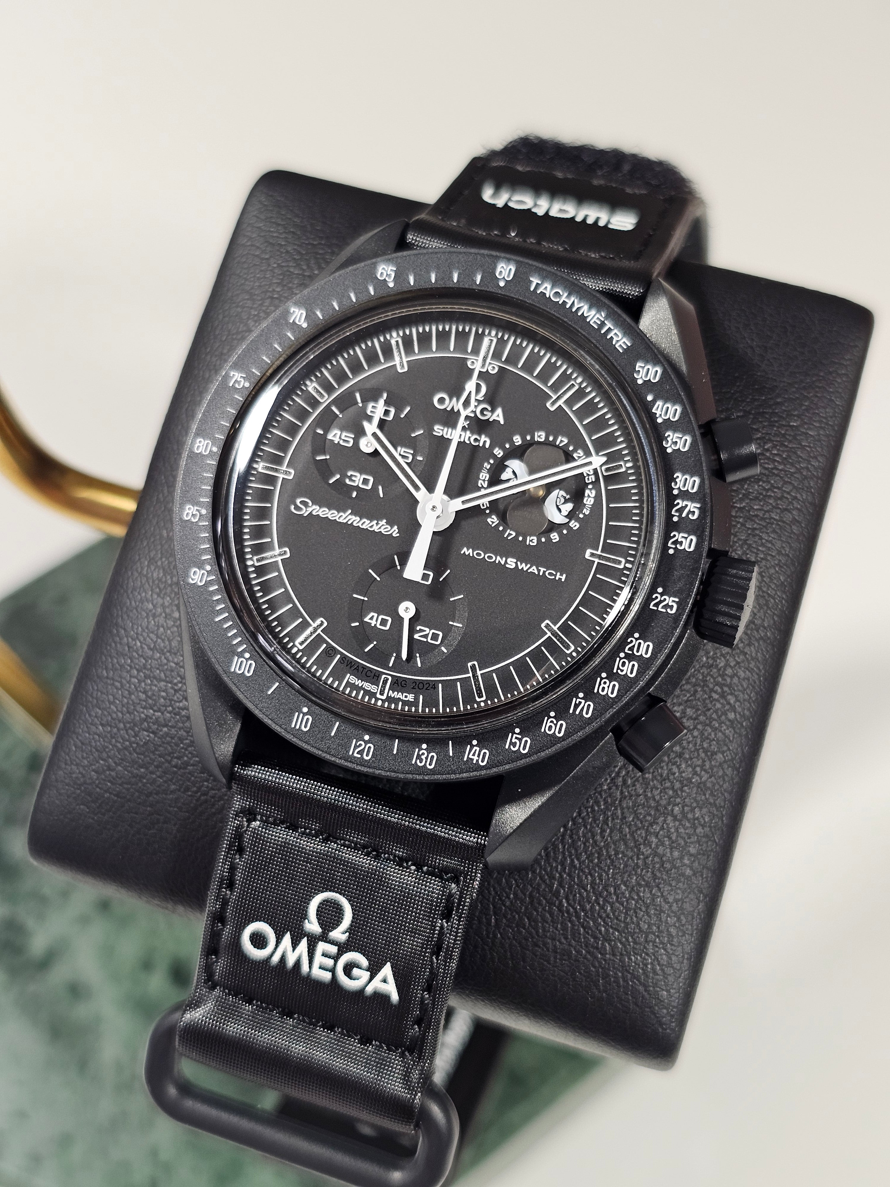 A standout feature is the black moon phase function, a symbol of poetic elegance, showcasing Snoopy, the beloved NASA safety mascot since the 1960s, adorning the moon phase disc at the 2 o'clock position. Under UV light, a secret quote from a Snoopy comic emerges, surrounded by crescent moons and stars on this distinctive subdial. Each dial is branded with the OMEGA X Swatch signature, the renowned Speedmaster logo, and the MoonSwatch insignia.