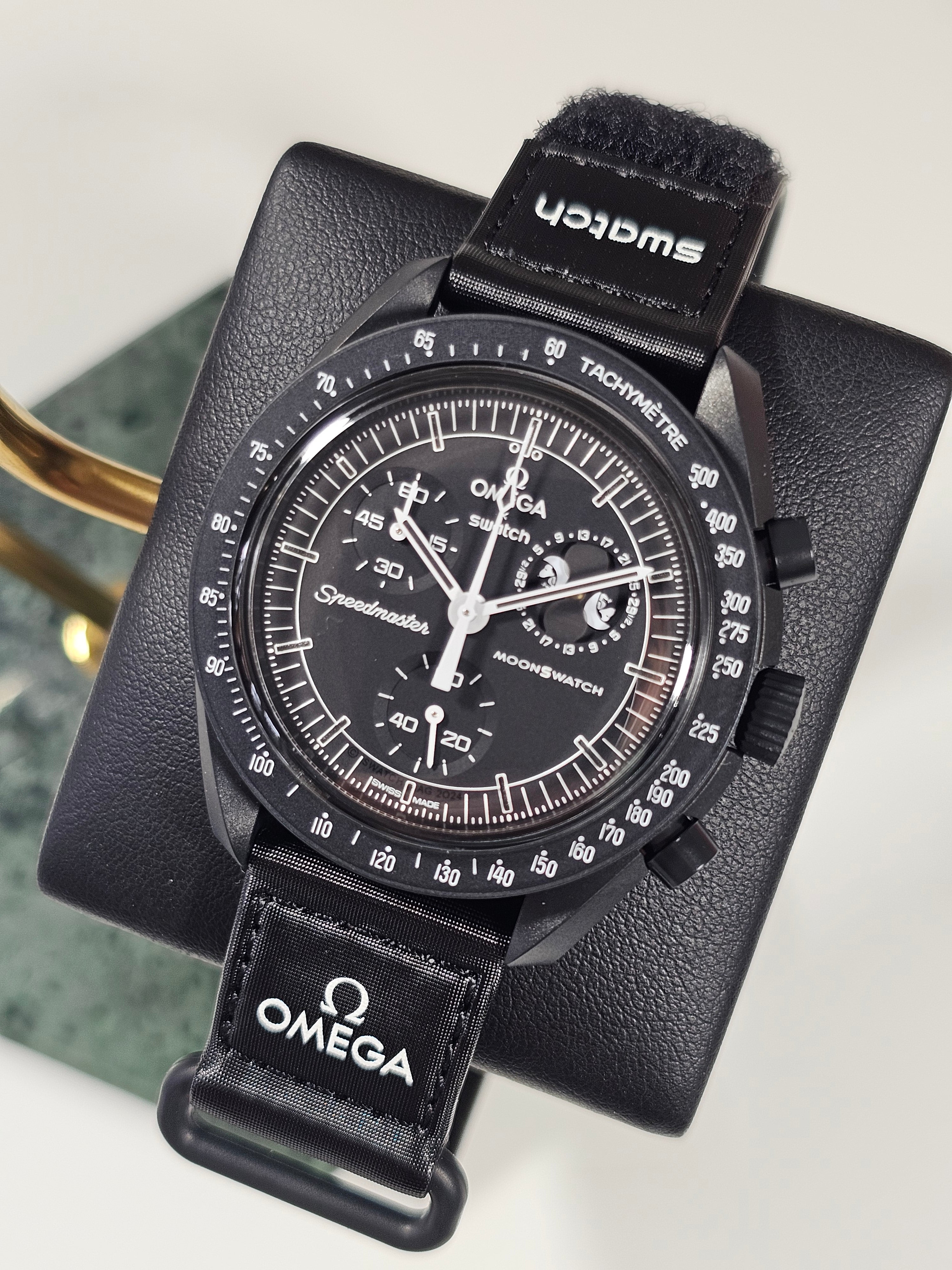Introducing the Snoopy MoonSwatch "NEW MOON," a model that redefines elegance with its sophisticated all-black aesthetic. Crafted with a Bioceramic case, crown, pushers, and complemented by a VELCRO strap, this timepiece is a masterpiece of design. The contrast of the white hands on the chronograph's seconds, subdials, and the tachymeter scale enhances its sleek appearance, while the subdials and bezel retain a classic black backdrop.