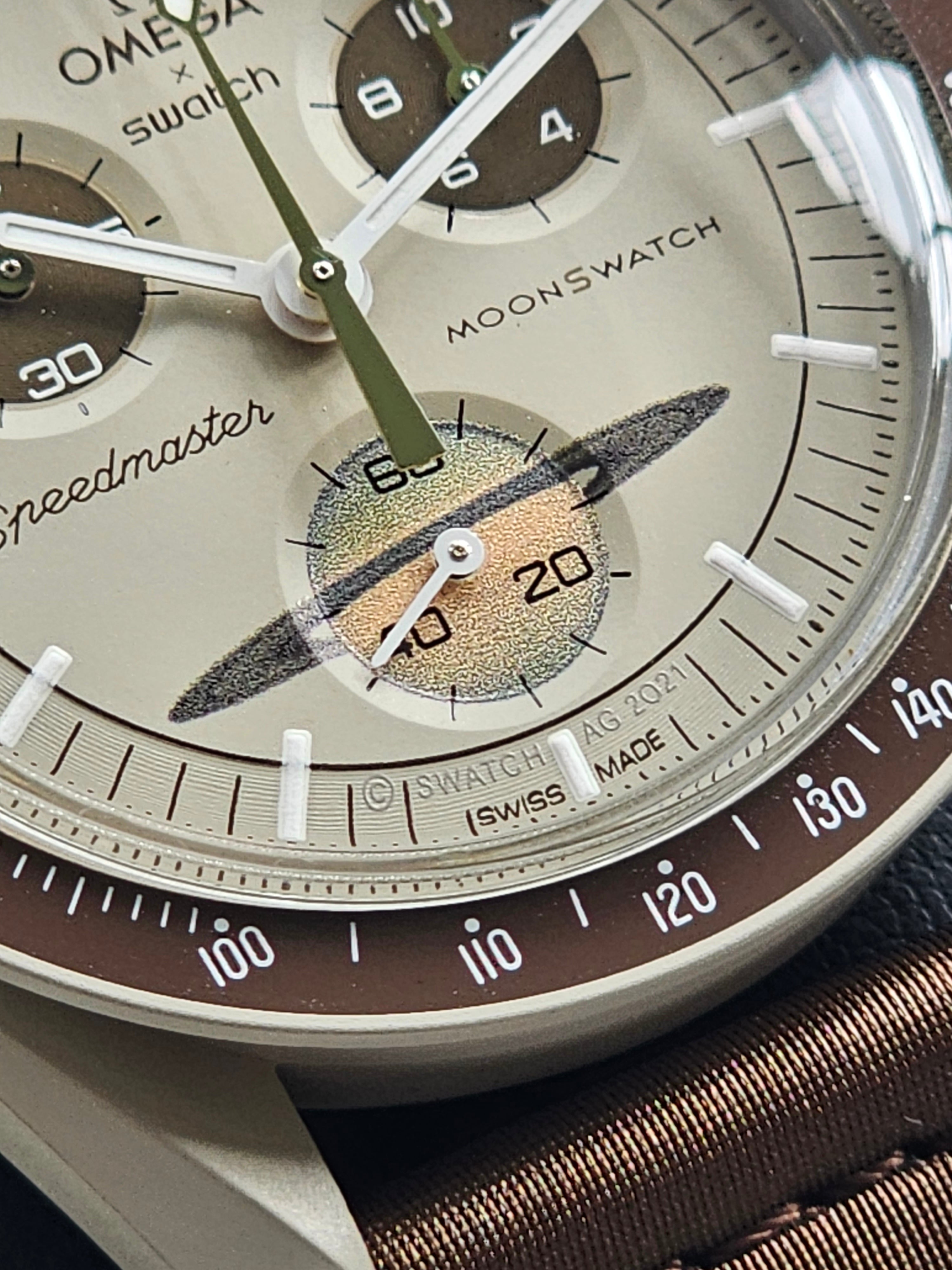 Experience the perfect juxtaposition of sandy beige tones against a rich brown dial and VELCRO strap on this captivating model. The brown chronograph seconds hand, subdial hands, and tachymeter scale background add a touch of warmth, while Saturn's iconic rings grace the seconds sub dial.