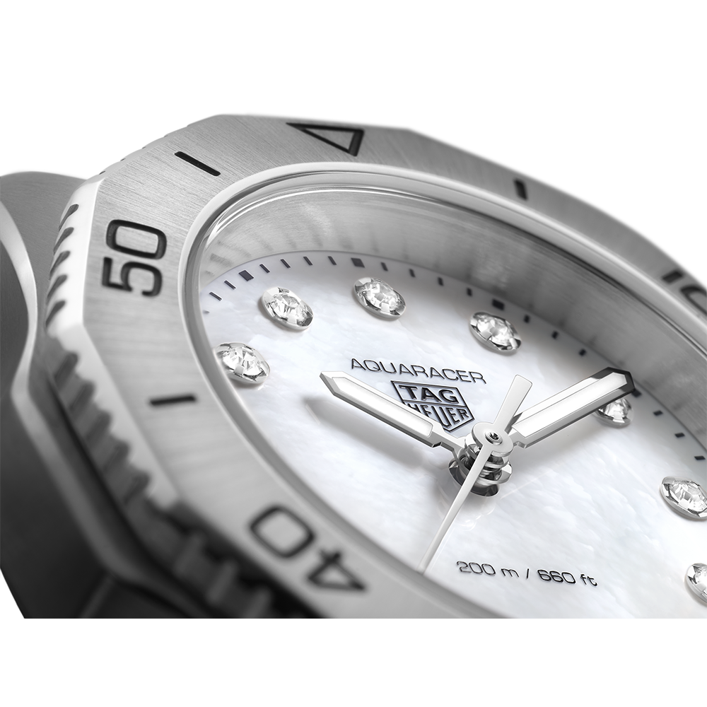 This TAG Heuer Aquaracer adds some sparkle to the versatile everyday companion. In addition to the diamond hour markers on this 30mm watch, the dial itself is made from mother of pearl. A perfect incentive for going beyond the limits.