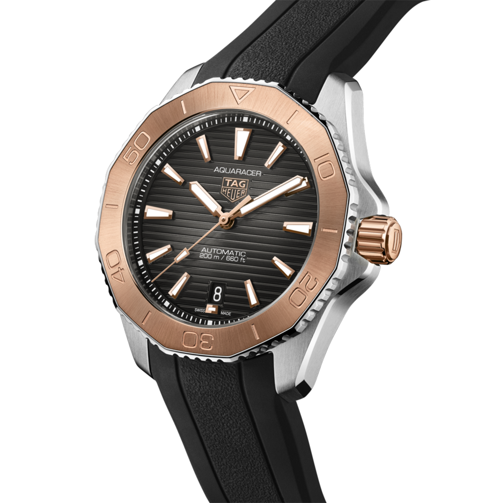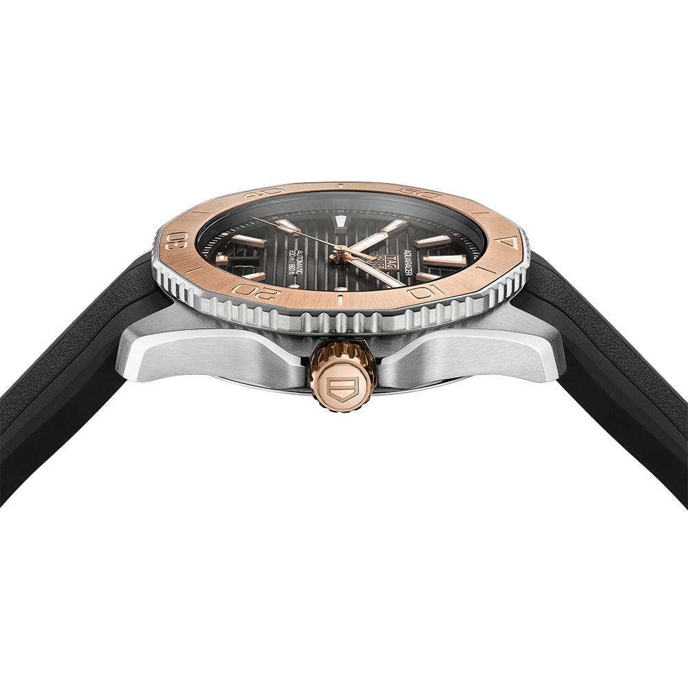 Luxury meets ultra-resistance in this showy TAG Heuer Aquaracer. The 18K 5N rose-gold bezel inlay and screw-down crown stand out next to the smokey-black dial adorned with highly legible hands and markers. A watch geared for every achievement. The intense black dial distills timeless elegance with its contrasting 18K 5N rose gold-plated hands and markers for swift time-telling day or night. Circling the black dial, the luxurious 18K 5N solid rose-gold unidirectional bezel inlay and matching screw-down crown offer exceptional resistance.