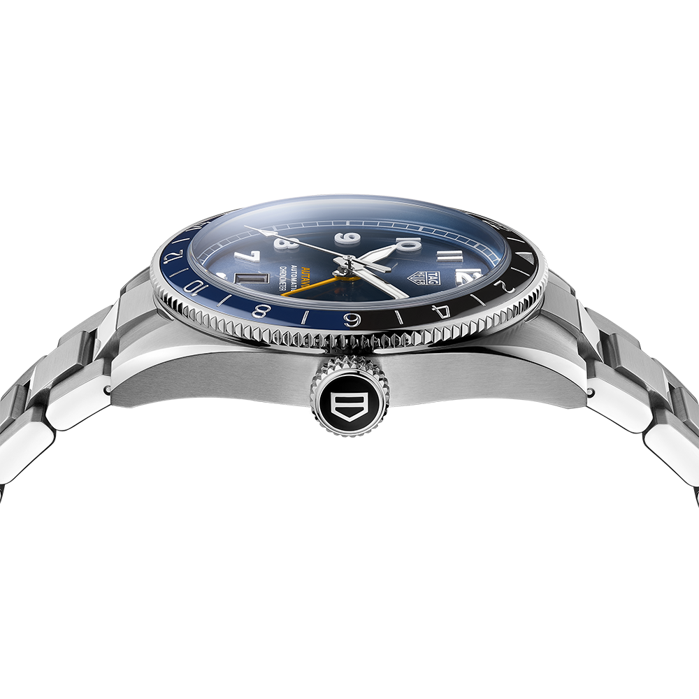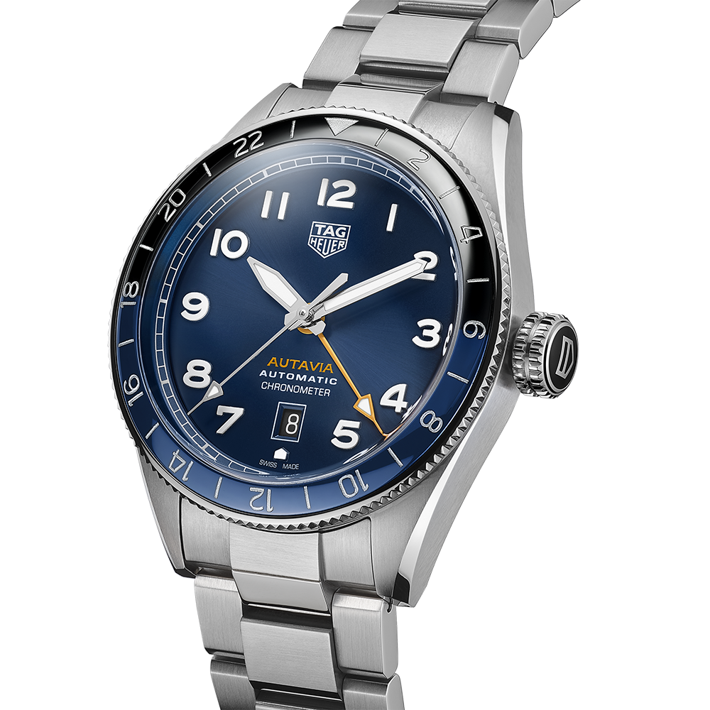 An authentic pilot’s watch with a heritage feel, this TAG Heuer Autavia is a reinvented classic. Ready for adventure, the heroic blue sunray brushed dial, with highly luminescent Super-Luminova hands and indexes, offers maximum legibility. Powered by the COSC certified manufacture Calibre 7, and adorned with a classic blue and black ceramic 24-hour scale bidirectional bezel, this GMT watch is ready to take the plunge.