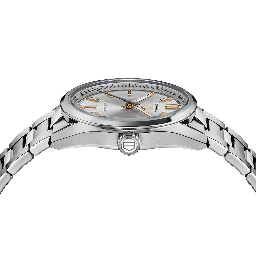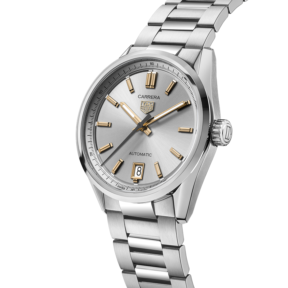Sporting thinner lugs, this ultra-ergonomic TAG Heuer Carrera strikes the perfect balance between elegance and comfort. Details such as the fading, light-to-dark gradient ring along the flange add prestige to the robust steel design. A true classic. The warm sunray silver dial is contrasted by superb 18K 5N rose gold-plated hands and applied indexes. An homage to timeless elegance. More ergonomic than ever, the 36mm steel case integrates the new Calibre 7 automatic movement, offering 56 hours of power reserve. Refined and determined.