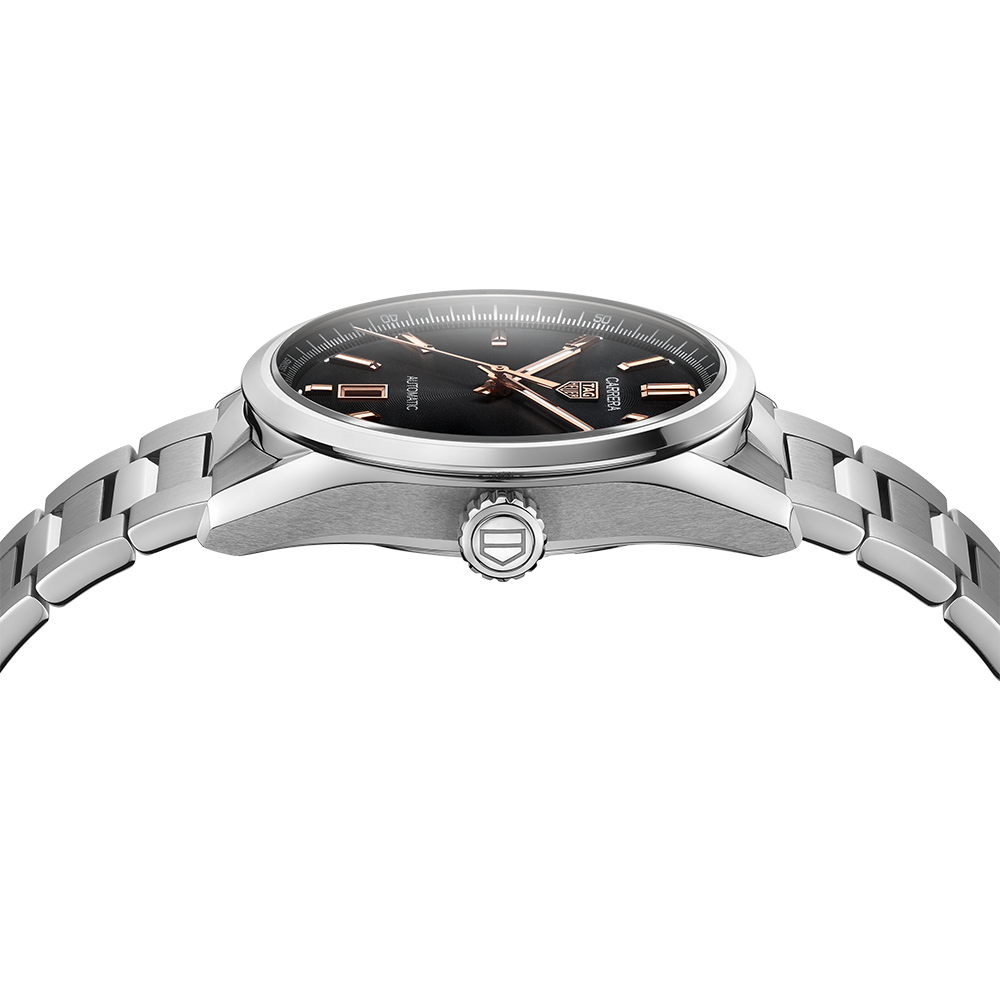 With its indulgent black dial and 5N rose gold highlights, this TAG Heuer Carrera is made for city dwellers. Behind the striking luxury lies conviction: with its automatic calibre and technical construction, this watch is as strong as it is ambitious.