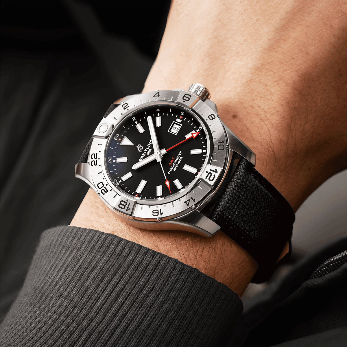 BreitlingAvenger 44mm Black Dial Automatic Strap Watch A32320101B1X1. Stainless steel 42mm case and bezel all on ablackcalfskin leather strap. This men's watch has a black dial with luminous applied hands and hour indexes, date display at the 3 o'clock position. Water resistant up to 300m and sapphire crystal glass. Power reserve up to 70 hours. Automatic movement.