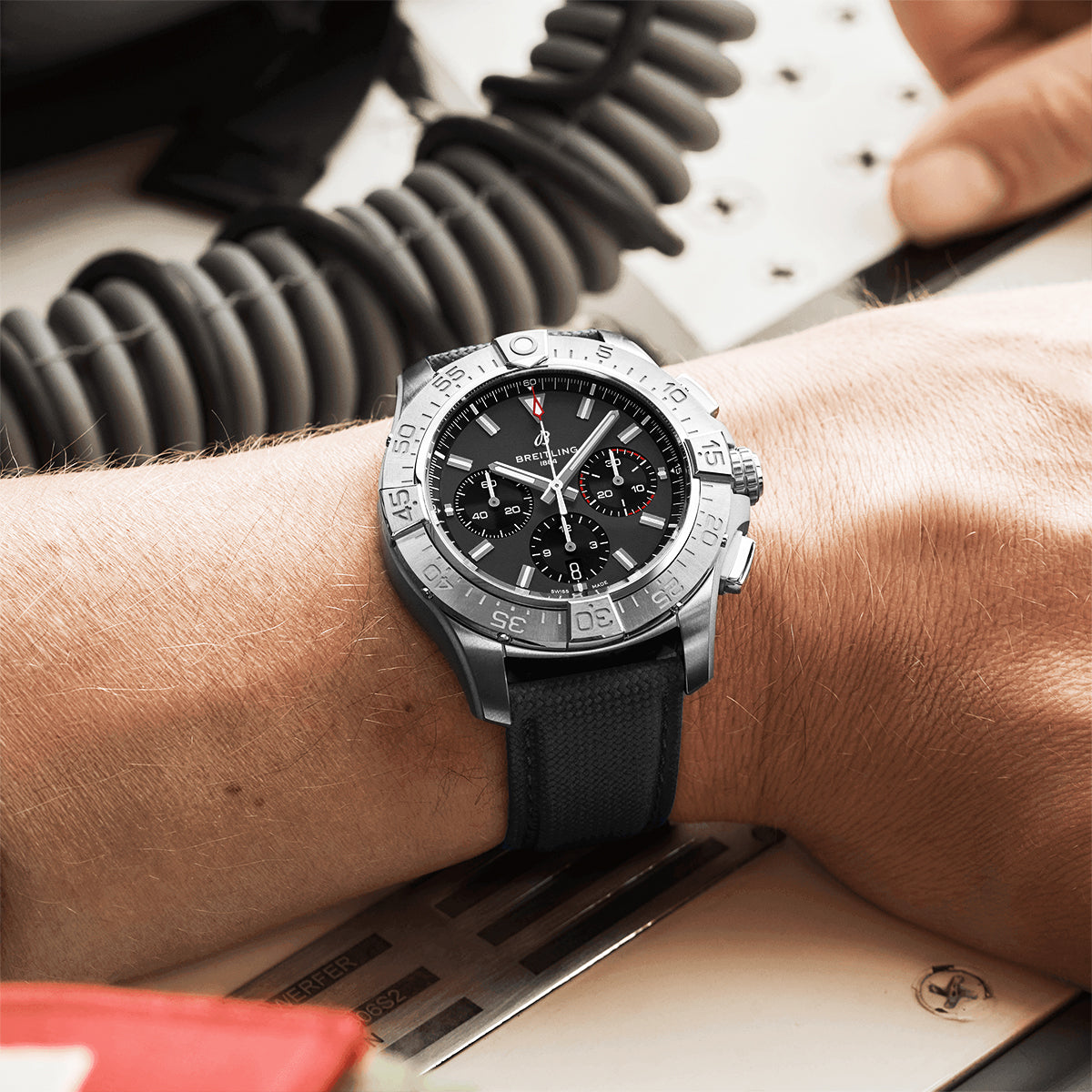 BreitlingAvenger 44mm Black Dial Automatic Chronograph Strap Watch AB0147101B1X1. Stainless steel 44mm case and bezel all on a black calfskin strap. This men's watch has a black dial with luminous applied hands and hour indexes, date display at the 6 o'clock position. Water resistant up to 300m and sapphire crystal glass. Power reserve up to 70 hours. Automatic movement.