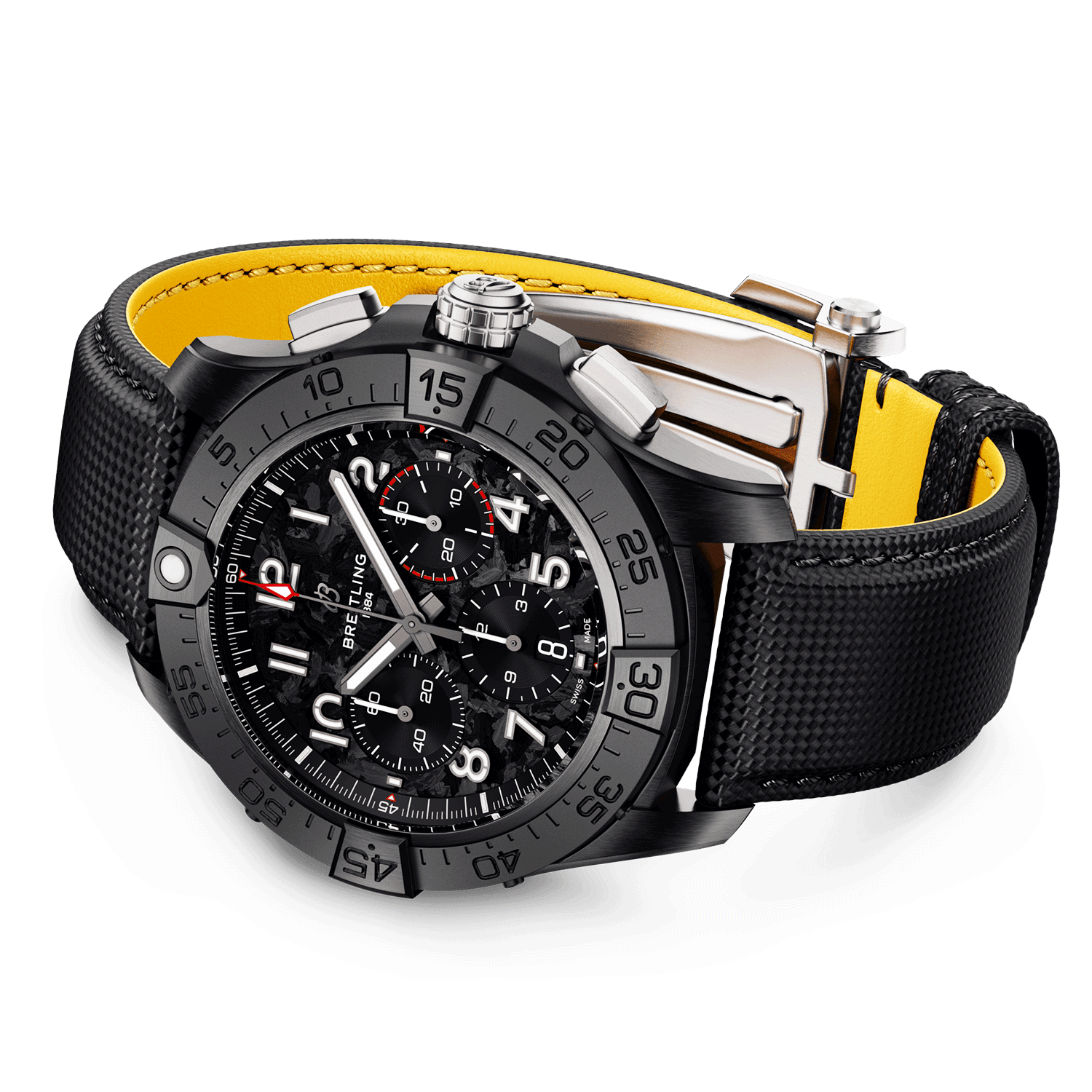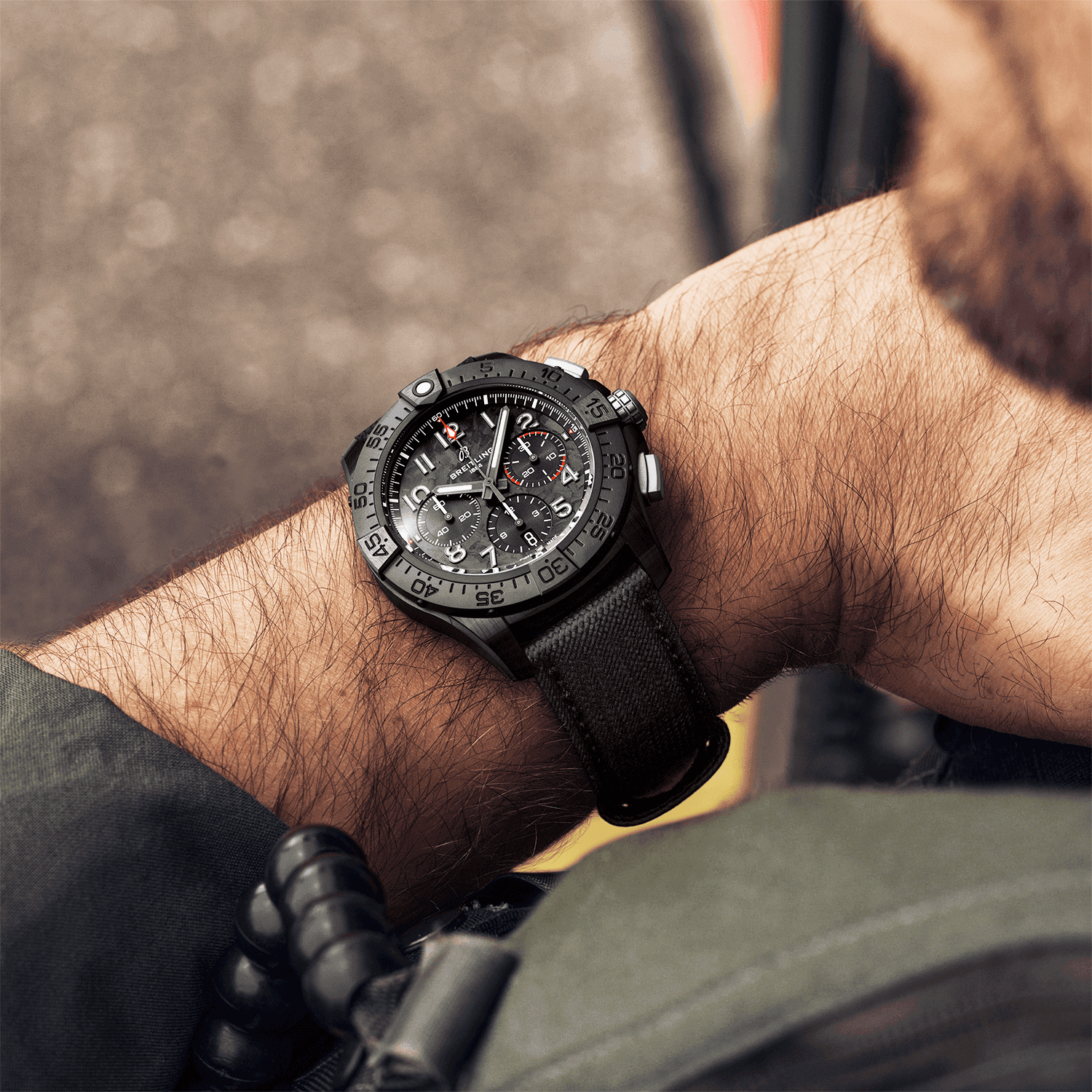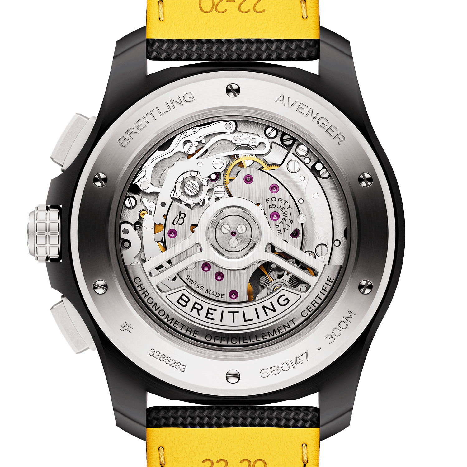 BreitlingAvenger Night Mission 44mm Men's Black Ceramic Watch SB0147101B1X1. Black ceramic 44mm case and bezel all on ablack calfskin leather strap.This men's watch has a black patterned dial with luminous applied hands and hour indexes, date display at the 6 o'clock position. Water resistant up to 300m and sapphire crystal glass. Power reserve up to 70 hours. Automatic movement.