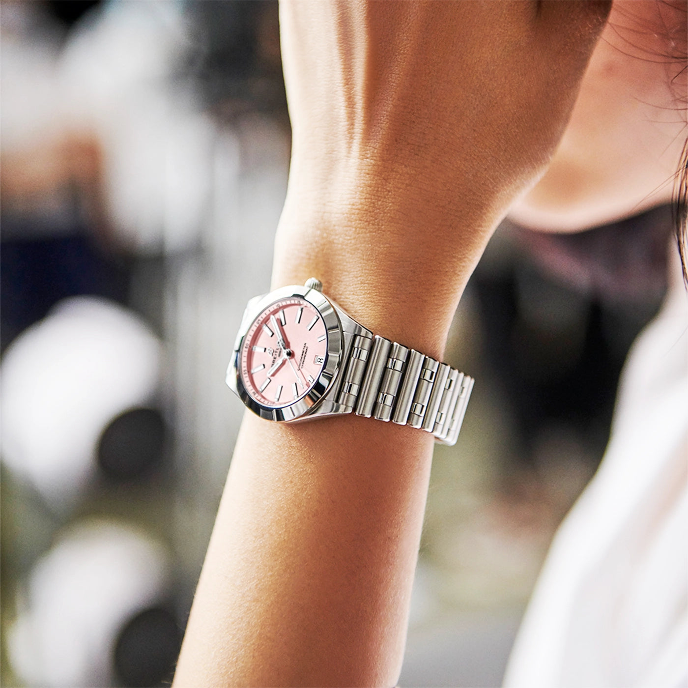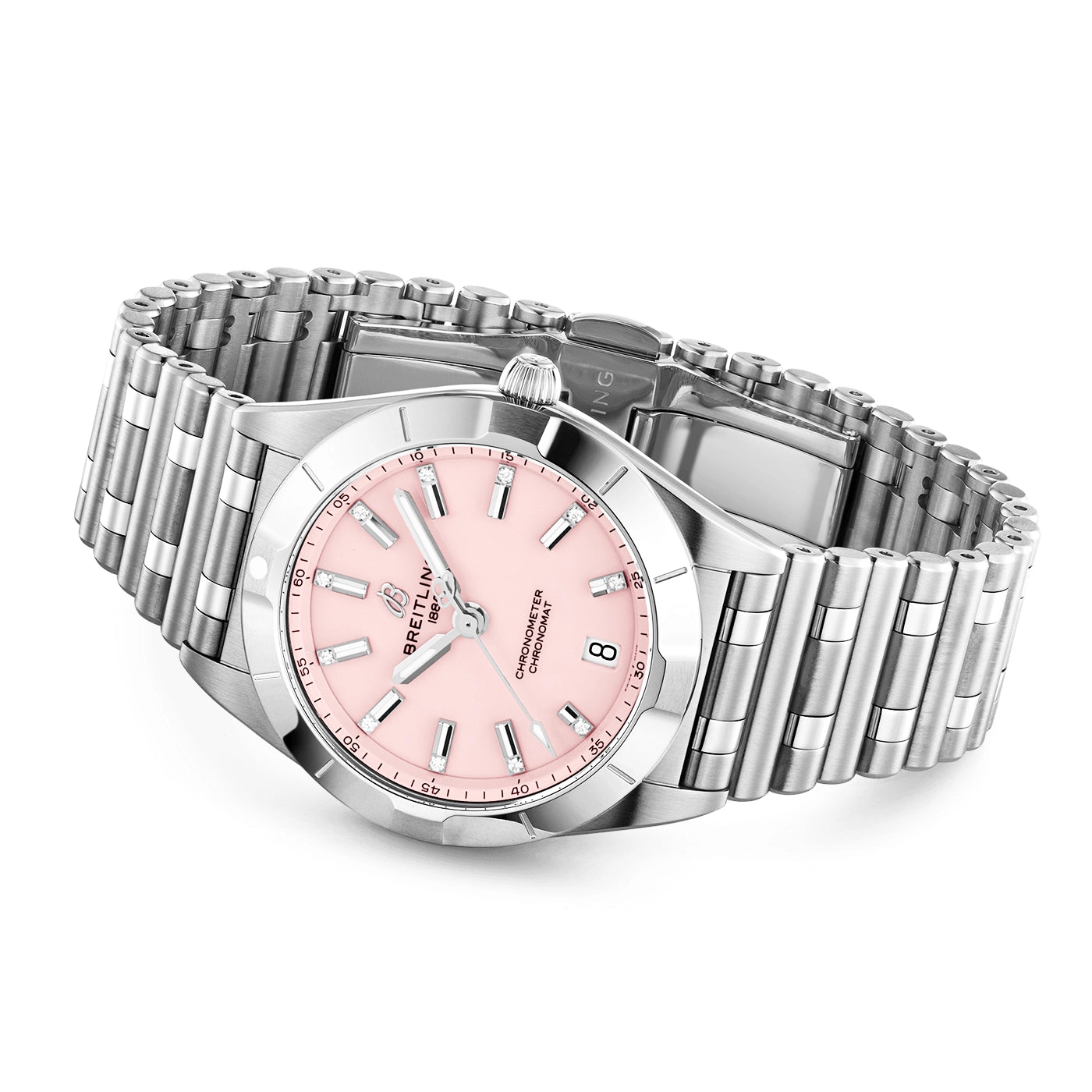 Introducing the Breitling Chronomat 32mm Pink Diamond Dial Ladies Bracelet Watch A77310101K1A1, a luxurious and sophisticated timepiece for women who appreciate elegance and precision. The 32mm stainless steel case and bezel are paired with a matching stainless steel Rouleaux bracelet for a seamless and refined look.