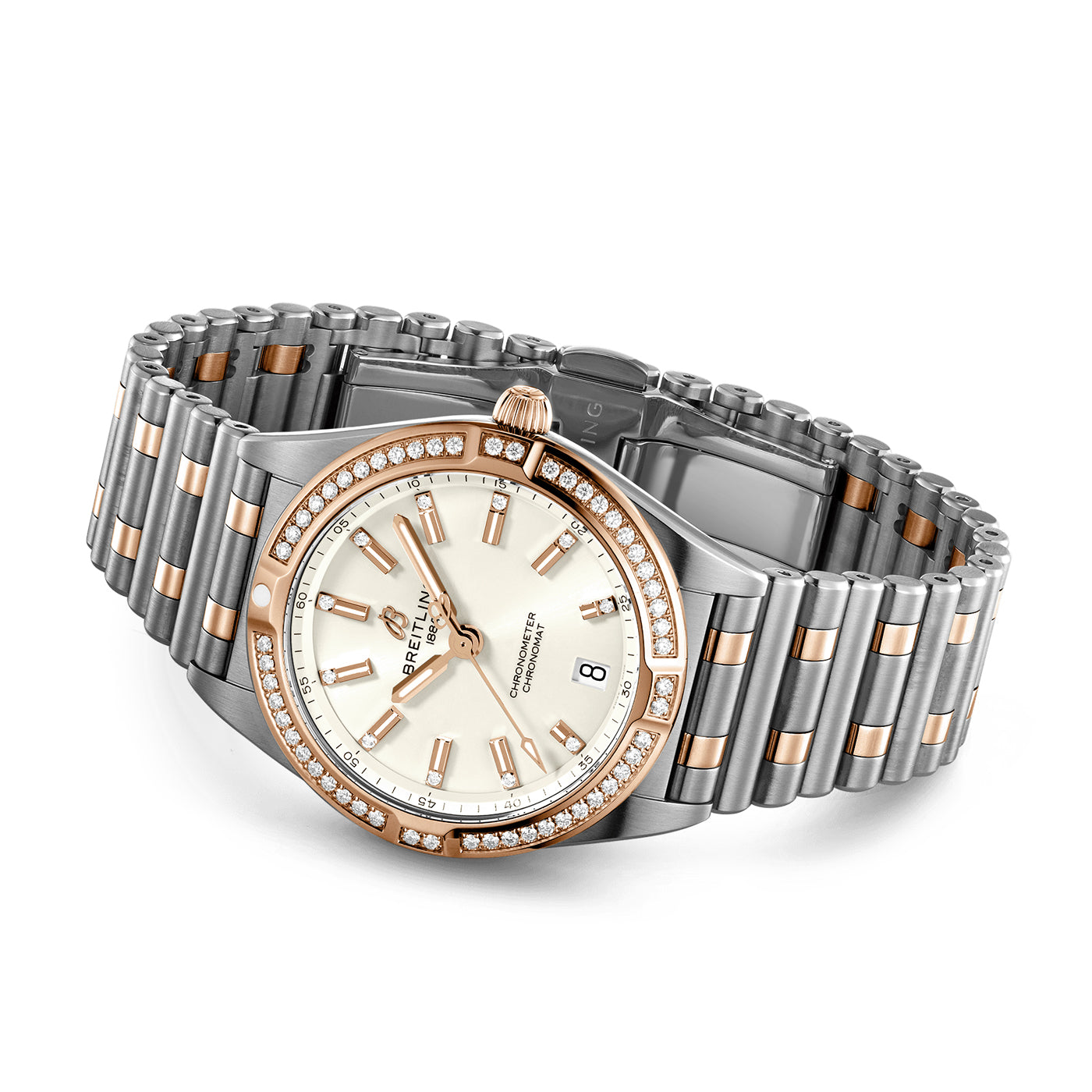 Breitling Chronomat 32mm Two-Tone Silver Diamond Dial Ladies Bracelet Watch U77310591A1U1. Stainless steel & 18ct rose gold 32mm case and diamond set bezel all on a stainless steel & 18ct rose gold bracelet. This watch has a silver dial with rose golden hands and 11 diamond set hour markers, date display at the 6 o'clock position. Water resistant up to 100m and sapphire crystal glass. Quartz movement.