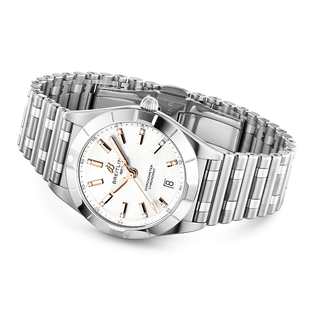 Introducing the Breitling Chronomat 32mm White Mother of Pearl Diamond Dial Bracelet Watch A77310101A4A1, a sophisticated and elegant timepiece for women who value style and precision. The 32mm stainless steel case and bezel are beautifully complemented by a matching stainless steel bracelet, creating a refined and harmonious appearance.