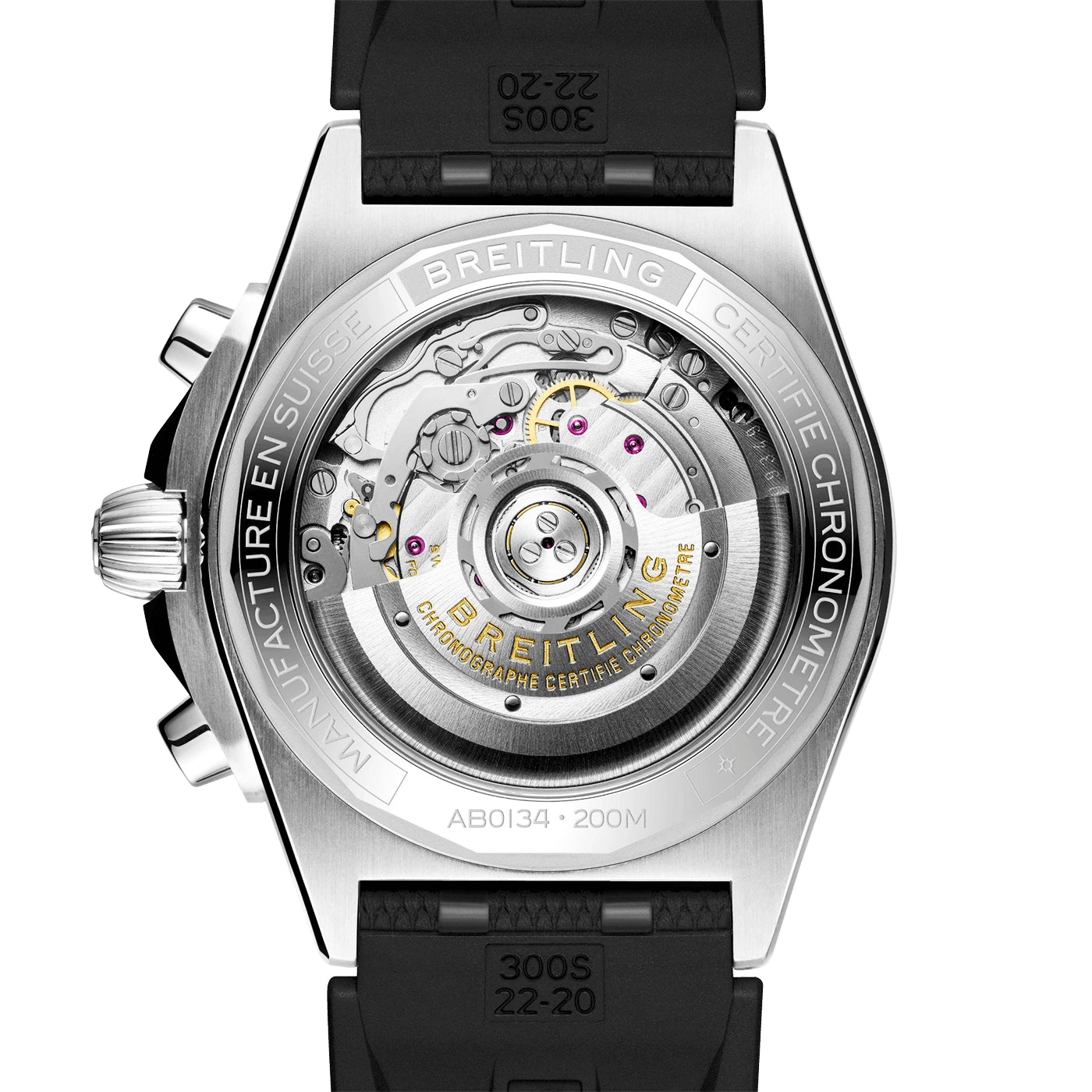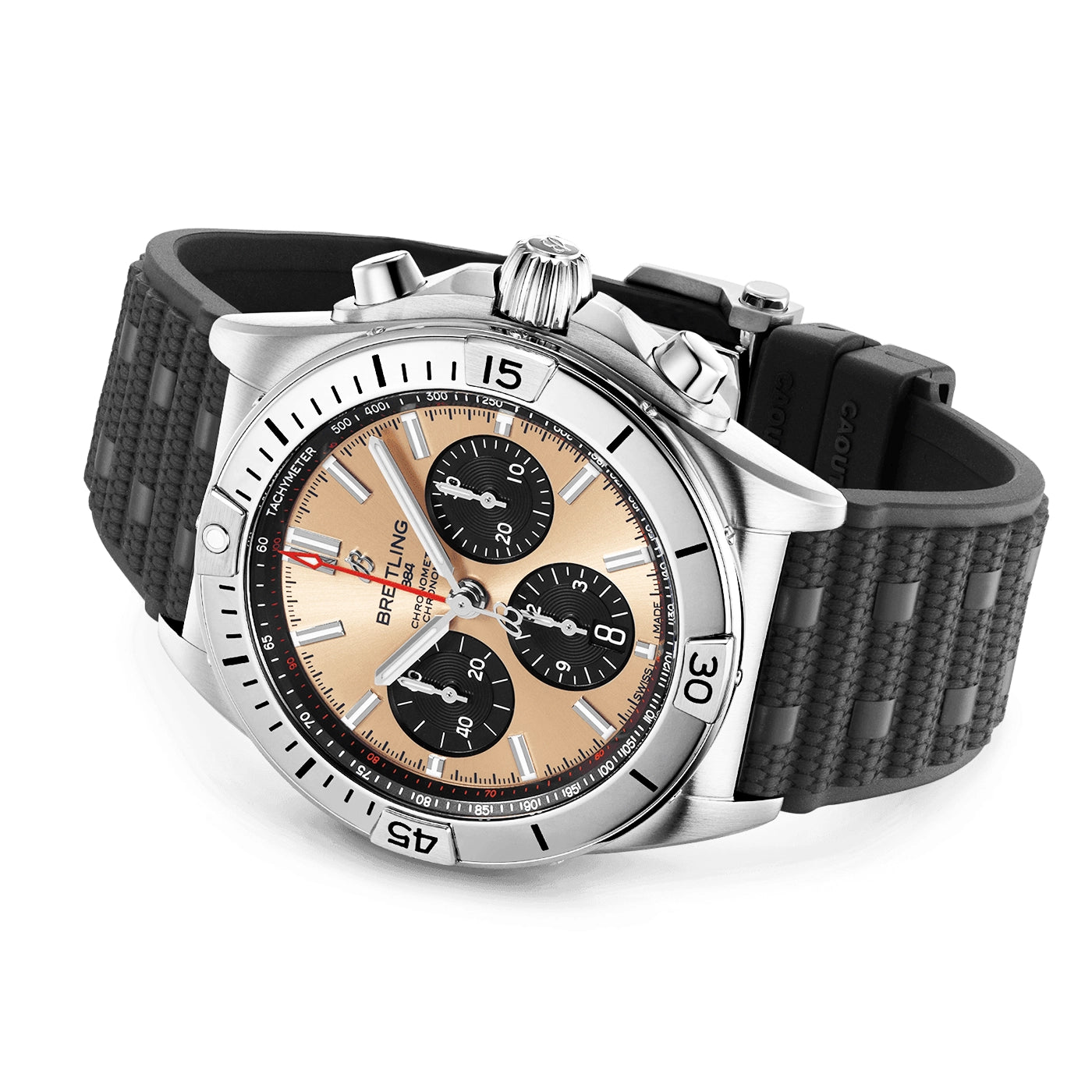 Breitling Chronomat 42mm Rose Gold Dial Men's Automatic Strap Watch AB0134101K1S1. Stainless steel 42mm case and bezel all on a black rubber strap. This men's watch has a sunray rose golden dial with polished hands and hour markers, date display at the 6 o'clock position, red seconds hand. Sapphire crystal glass and water resistant up to 200m. Automatic movement.