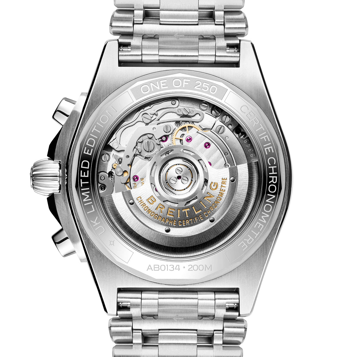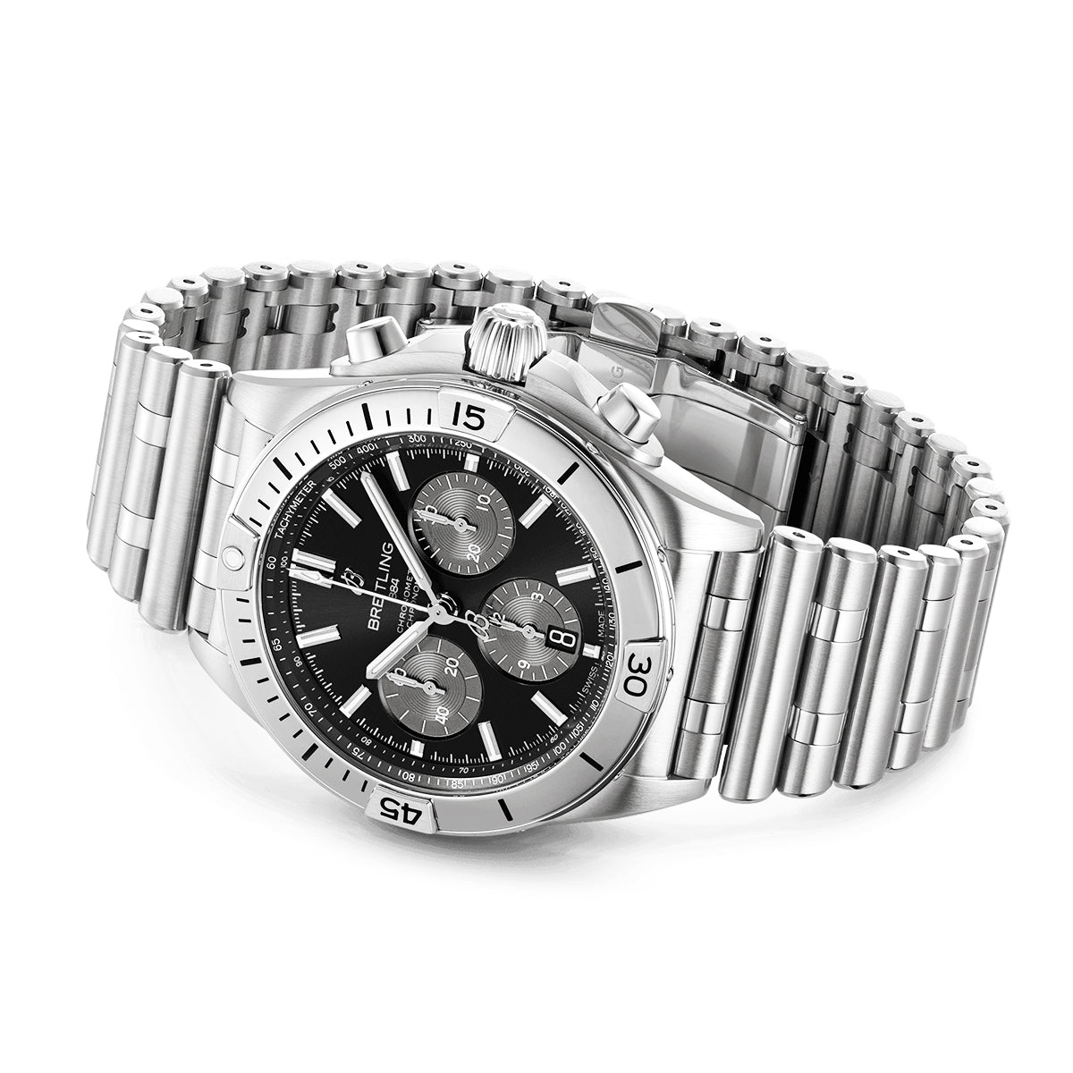 Breitling Chronomat 42mm UK Limited Edition Black/Grey Dial Watch AB01341B1B1A1. Stainless steel 42mm case and bezel all on a stainless steel Rouleaux bracelet. This men's watch has a black sunray dial with grey subdials, date display at the 6 o'clock position. Sapphire crystal glass and water resistant up to 200m. Automatic movement.