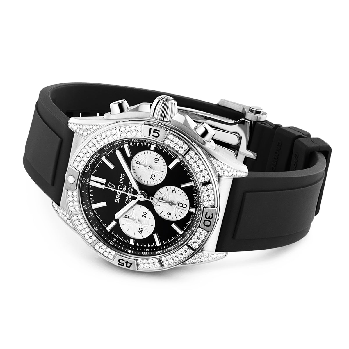 Breitling Chronomat B01 42mm Black/Silver Dial Diamond Set Watch AB0134721B1S1. Stainless steel & diamond set 42mm case and bezel all on a black rubber strap. This men's watch has a black dial with contrasting silver sub counters, date display at the 6 o'clock position. Sapphire crystal glass and water resistant up to 200m. Automatic chronograph movement.
