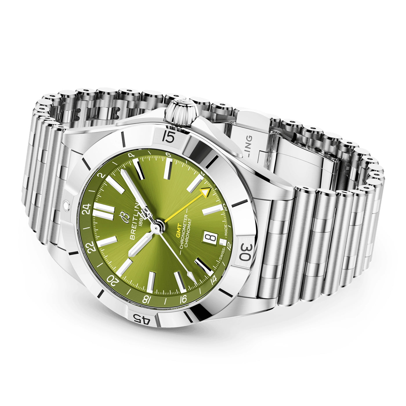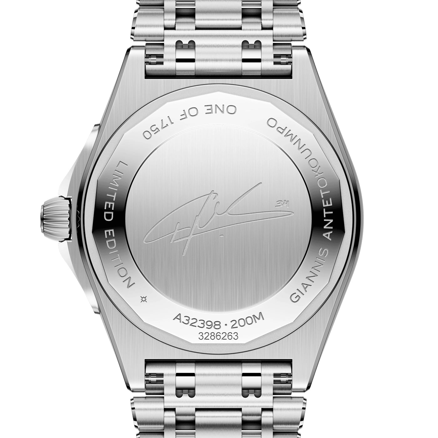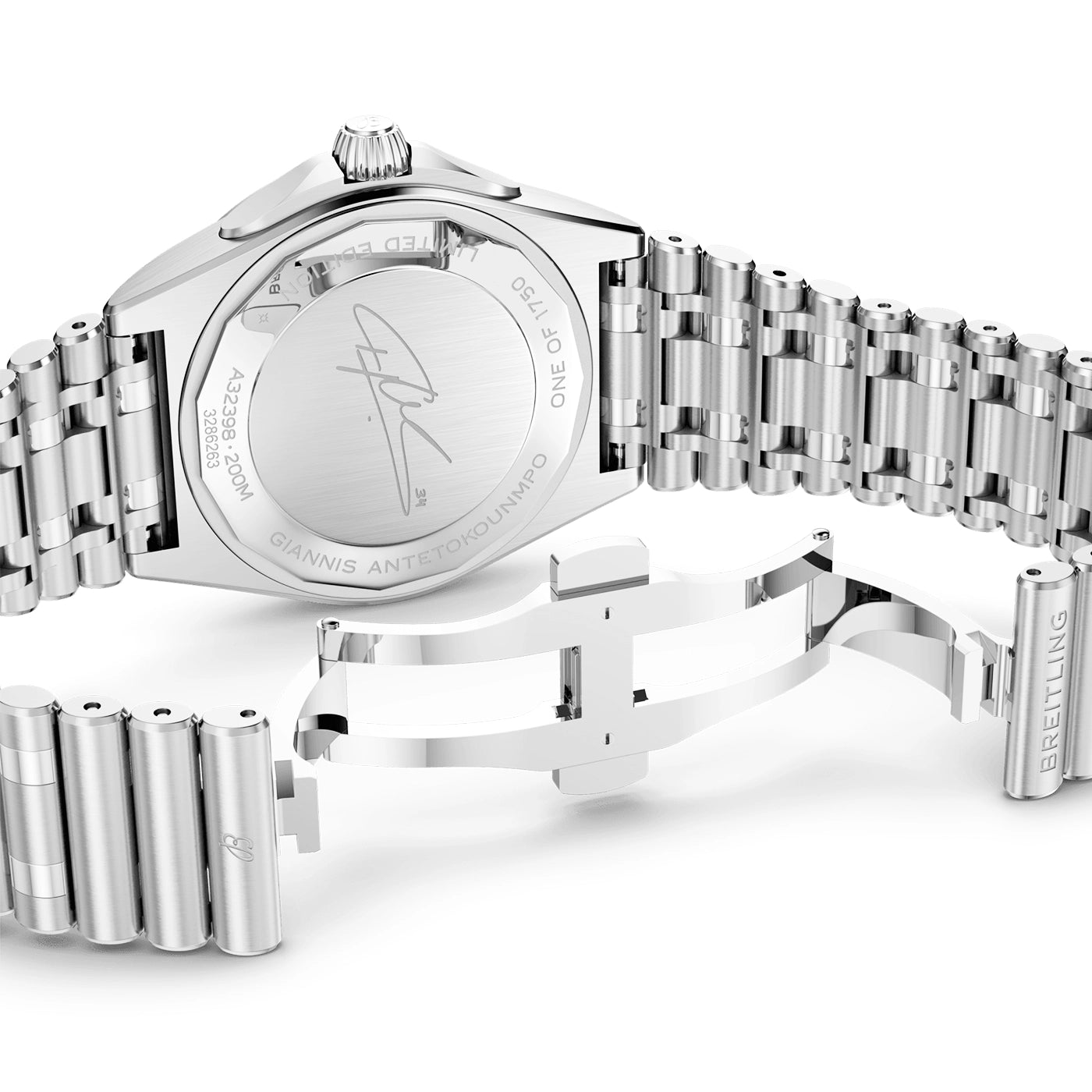 Breitling Chronomat GMT 40mm Giannis Antetokounmpo Limited Edition Watch A32398A11L1A1. Stainless steel 40mm case and unidirectional bezel all on a steel rouleaux bracelet. This men's watch has an olive green dial with polished hands and hour markers as well as a date display at the 6 o'clock position, yellow GMT hand. Special caseback with signature Water resistant up to 200m and sapphire crystal glass. Automatic movement.