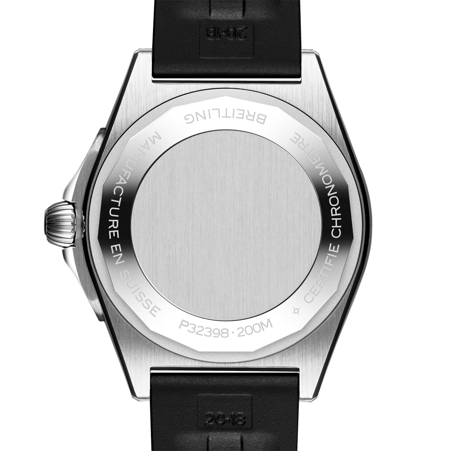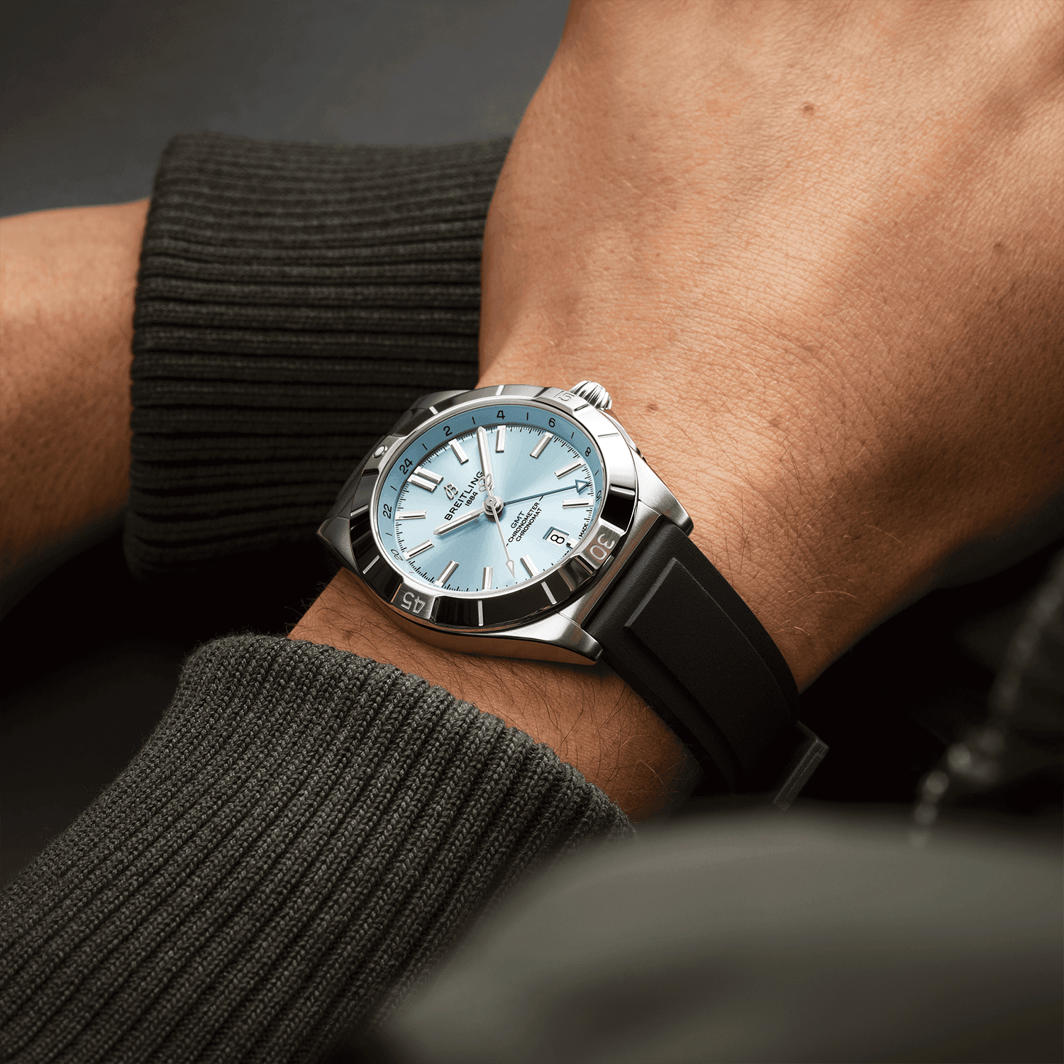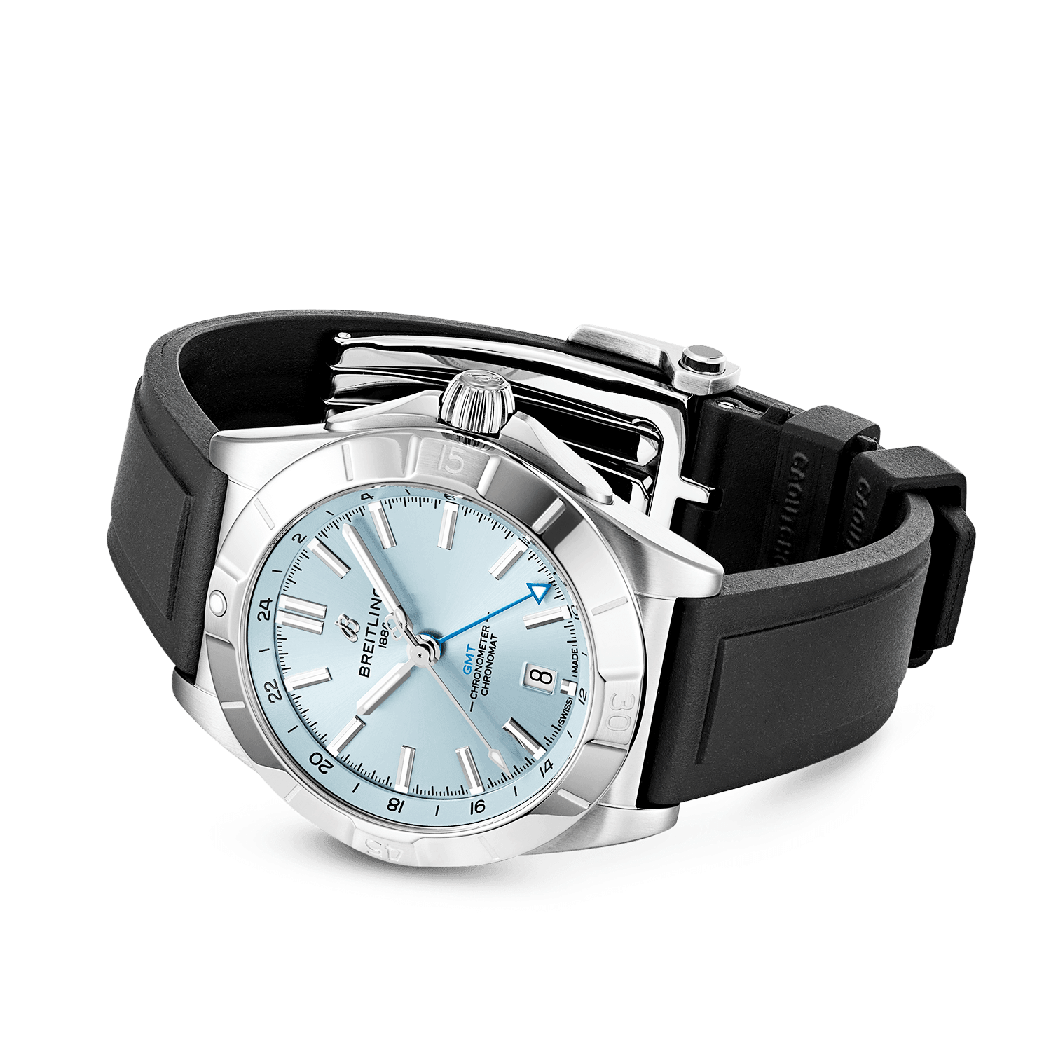 Breitling Chronomat GMT Platinum 40mm Ice Blue Dial Men's Strap Watch P32398101C1S1. Stainless steel 40mm case and unidirectional platinum bezel all on a black rubber strap. This men's watch has an ice blue dial with polished hands and hour markers as well as a date display at the 6 o'clock position, blue GMT hand. Water resistant up to 200m and sapphire crystal glass. Automatic movement.