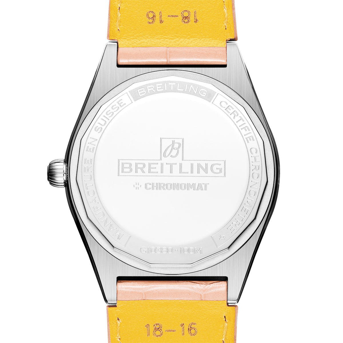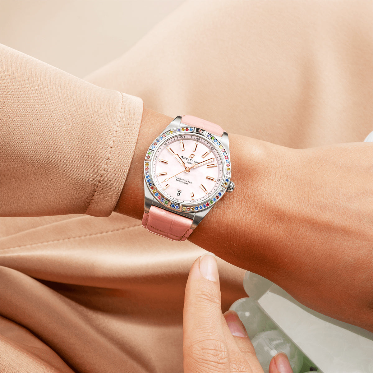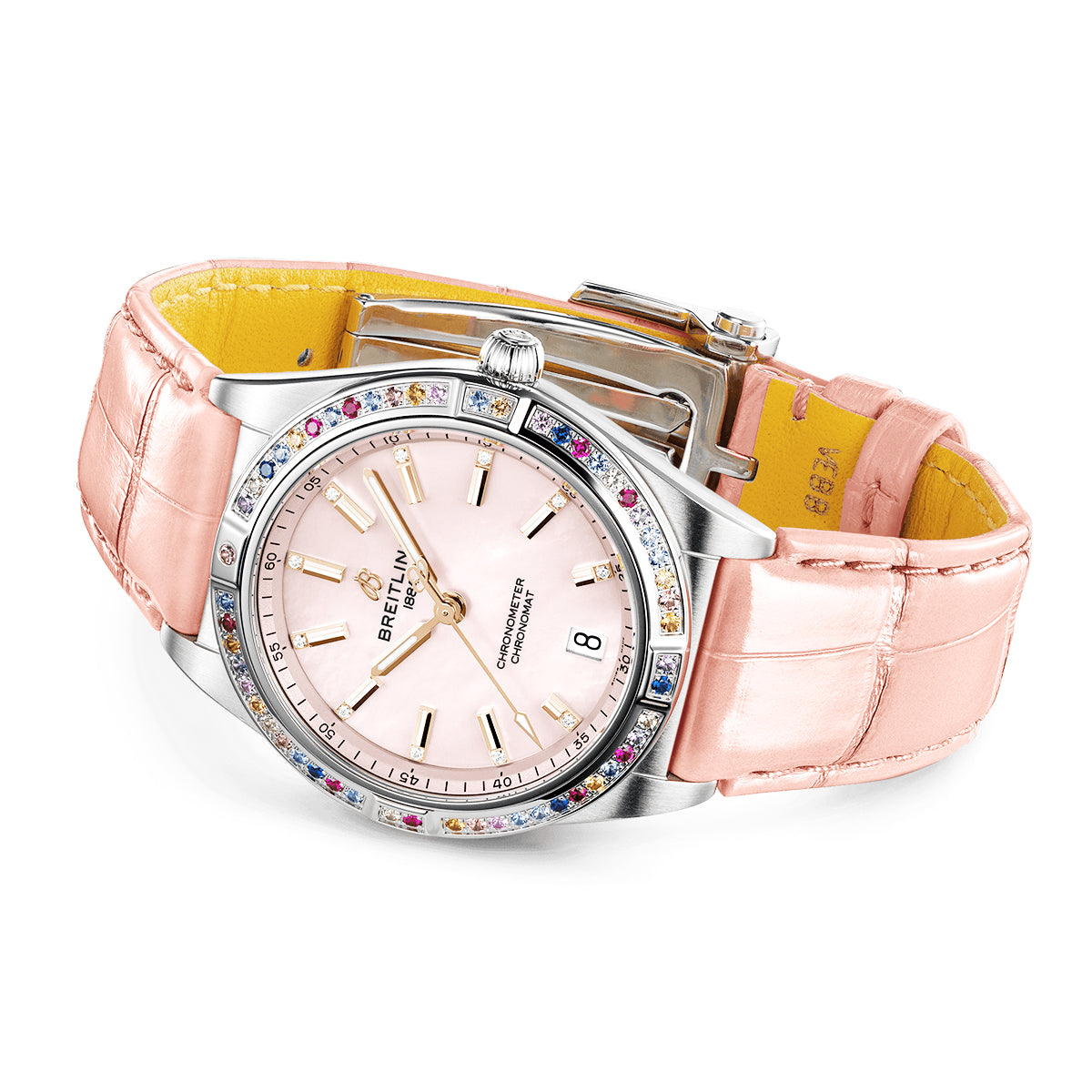BreitlingChronomat South Sea 36mm Steel & 18ct White Gold Pink Dial Watch G10380BB1K1P1. Stainless steel & 18ct white gold 36mm case with multi-coloured gemstone set bezel all on a pink leather strap. This ladies watch has a pink mother of pearldial with rose golden hands, 11 diamond set hour markers and a date display at the 6 o'clock position. Sapphire crystal glass. Automatic movement.