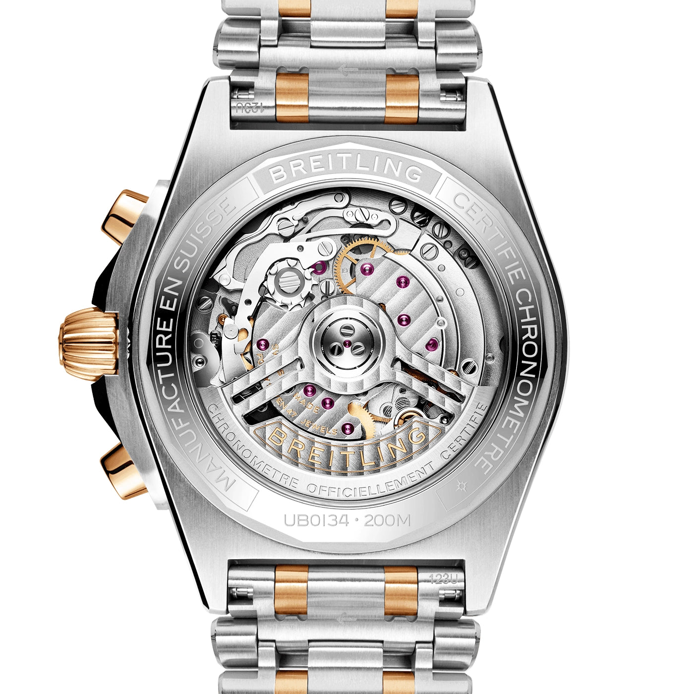Breitling Chronomat B01 42mm Two-Tone Deep Green Dial Chronograph Watch UB0134131L1U1. Stainless steel & 18ct red gold 42mm case and bezel all on a two-tone rouleaux-style stainless steel bracelet. This men's watch has a deep green sunray dial with polished and luminous applied hands and hour markers, contrasting black sub counters with date display at the 6 o'clock position. Sapphire crystal glass and water resistant up to 200m. Automatic chronograph movement.