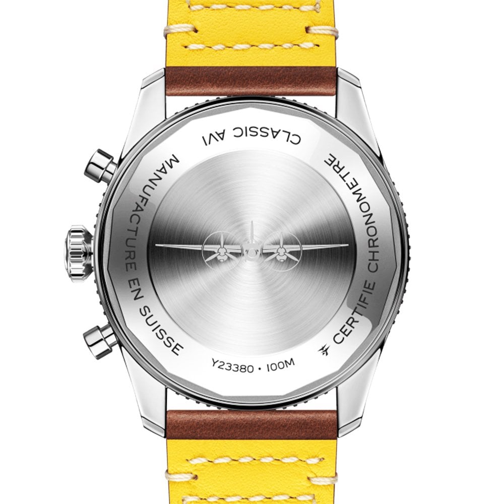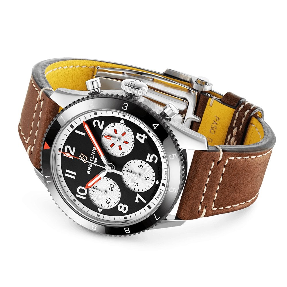 BreitlingClassic AVI Mosquito 42mm Black Dial Men's Chronograph Strap WatchY233801A1B1X1. Stainless steel 42mm case and polished ceramic bezel all on a leather strap. This men's watch has a black dial with contrasting silver chronograph sub counters. Special edition caseback. Water resistant up to 100m and sapphire crystal glass. Power reserve up to 70 hours. Automatic chronograph movement.