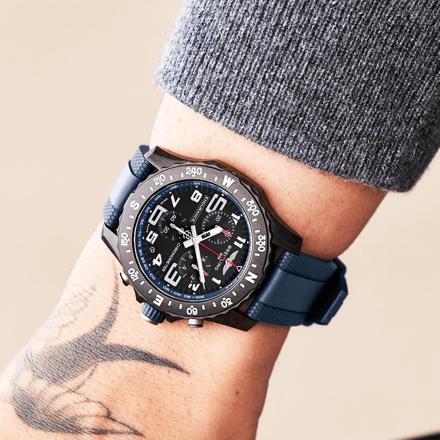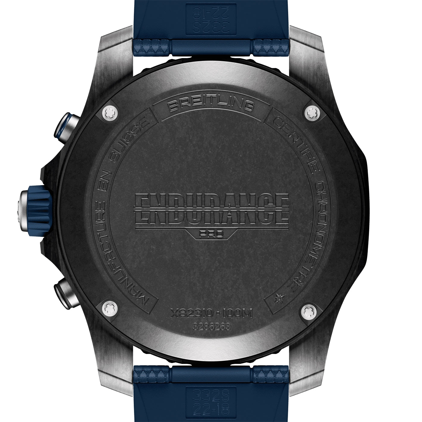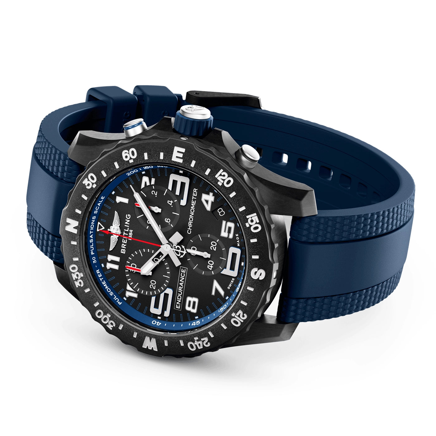 Breitling Endurance Pro 44mm Breitlight Black/Orange Rubber Strap Men's Watch X82310A51B1S2. Breitlight 44mm case and bezel all on a orange rubber strap. This men's watch has a black dial with luminous applied hands and hour markers, date display at the 4:30 o'clock position. Saphire crystal glass and water resistant up to 100m. Quartz chronograph movement.