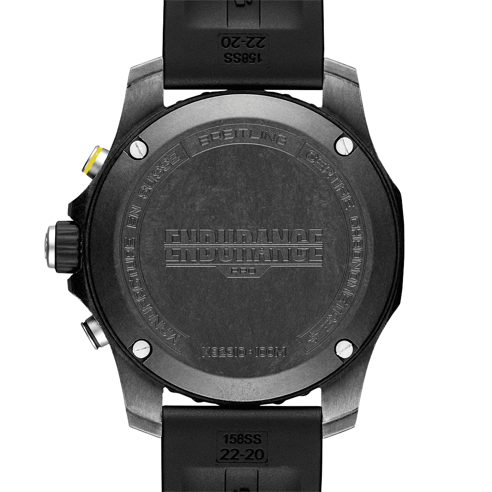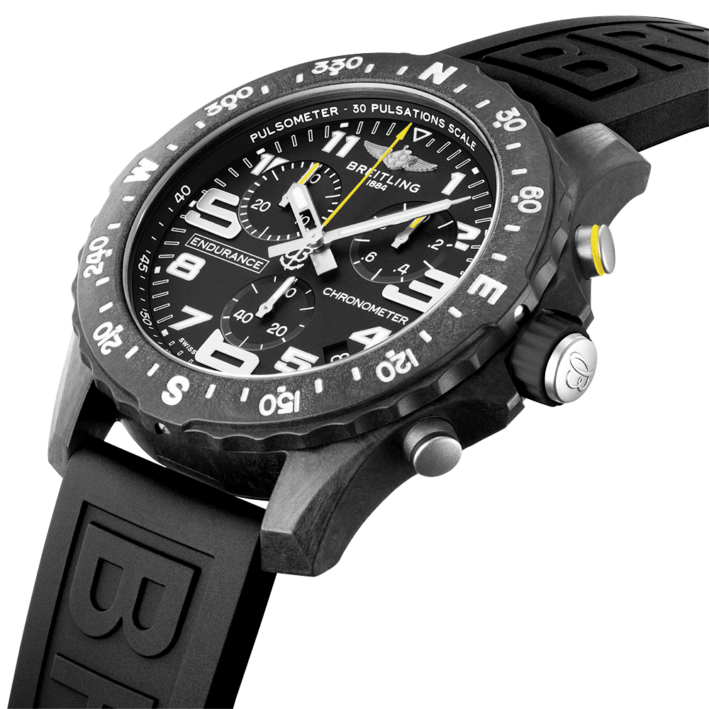 BreitlingEndurance Pro 44mm Breitlight Black Rubber Strap Men's Watch X82310E51B1S1. Breitlight 44mm case and bezel all on a deep black Diver Pro III rubber strap. This men's watch has a black dial with date display at the 4:30 o'clock position. Water resistant up to 100m and sapphire crystal glass. Breitling 82 SuperQuartz movement.