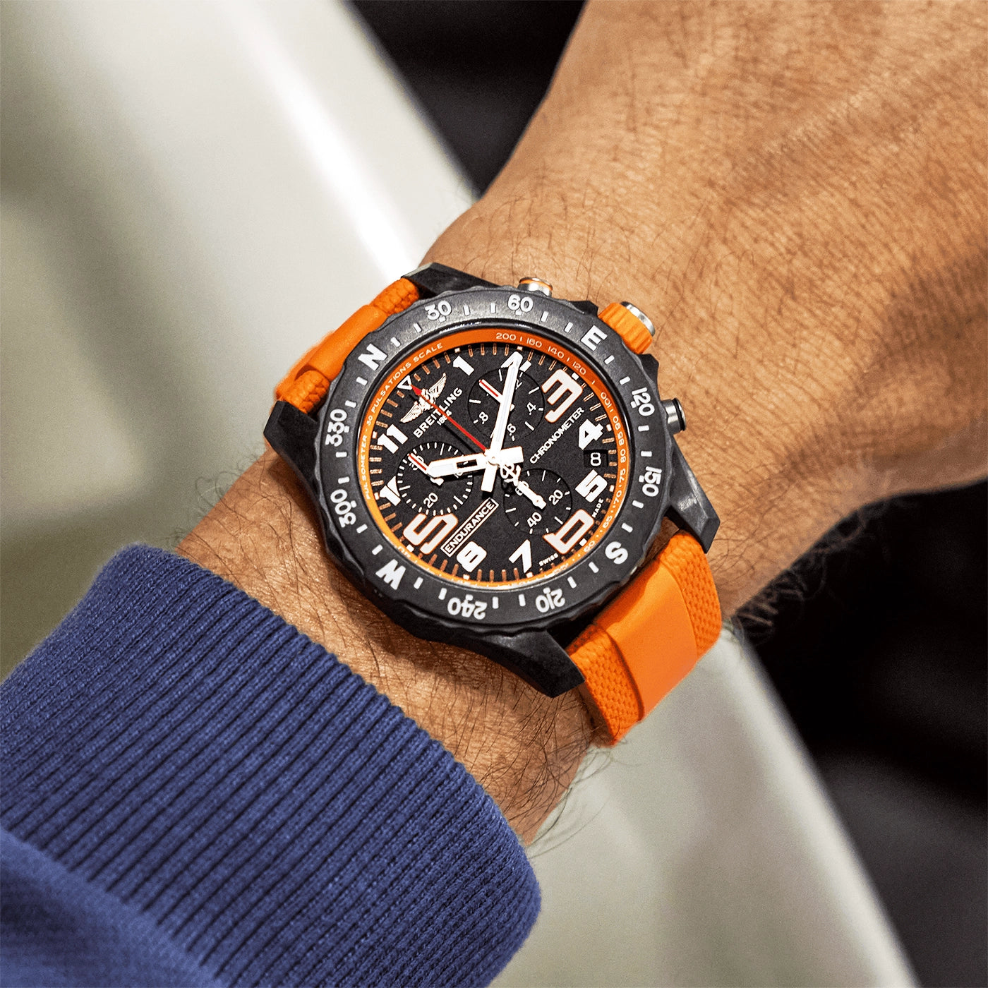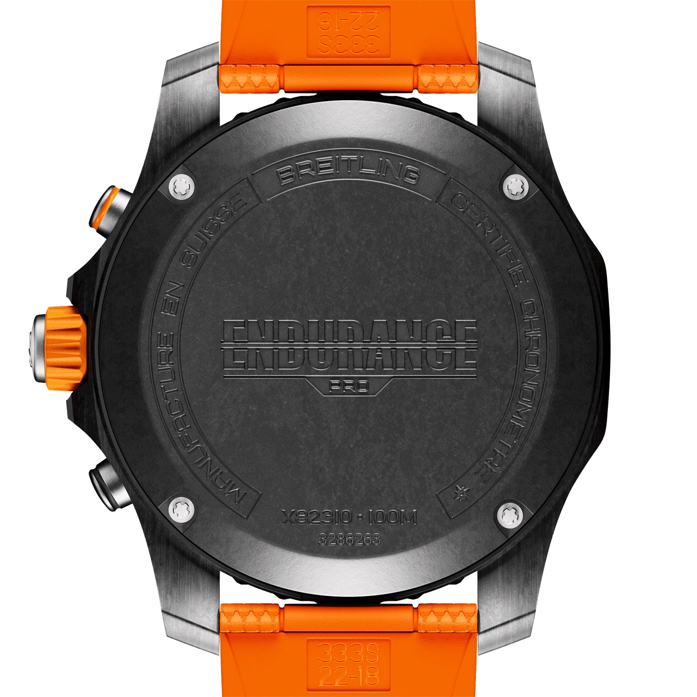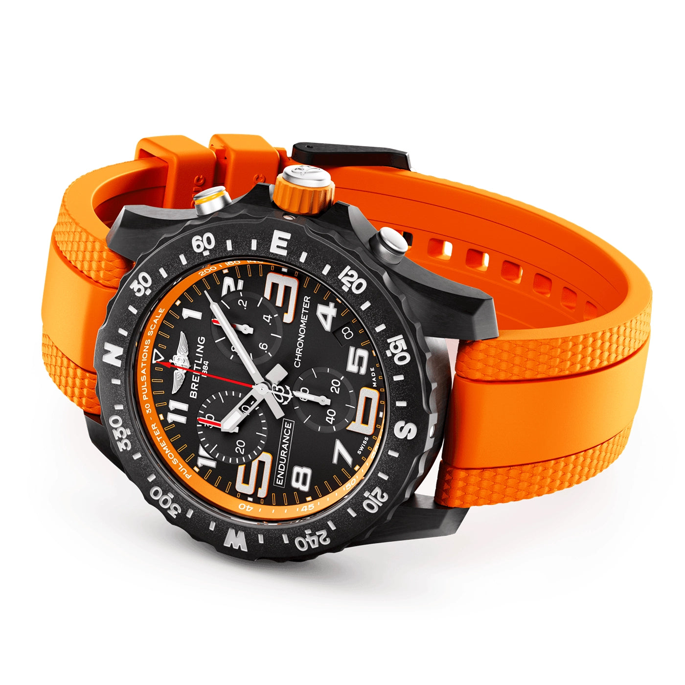 Breitling Endurance Pro 44mm Breitlight Black/Orange Rubber Strap Men's Watch X82310A51B1S2. Breitlight 44mm case and bezel all on a orange rubber strap. This men's watch has a black dial with luminous applied hands and hour markers, date display at the 4:30 o'clock position. Saphire crystal glass and water resistant up to 100m. Quartz chronograph movement.