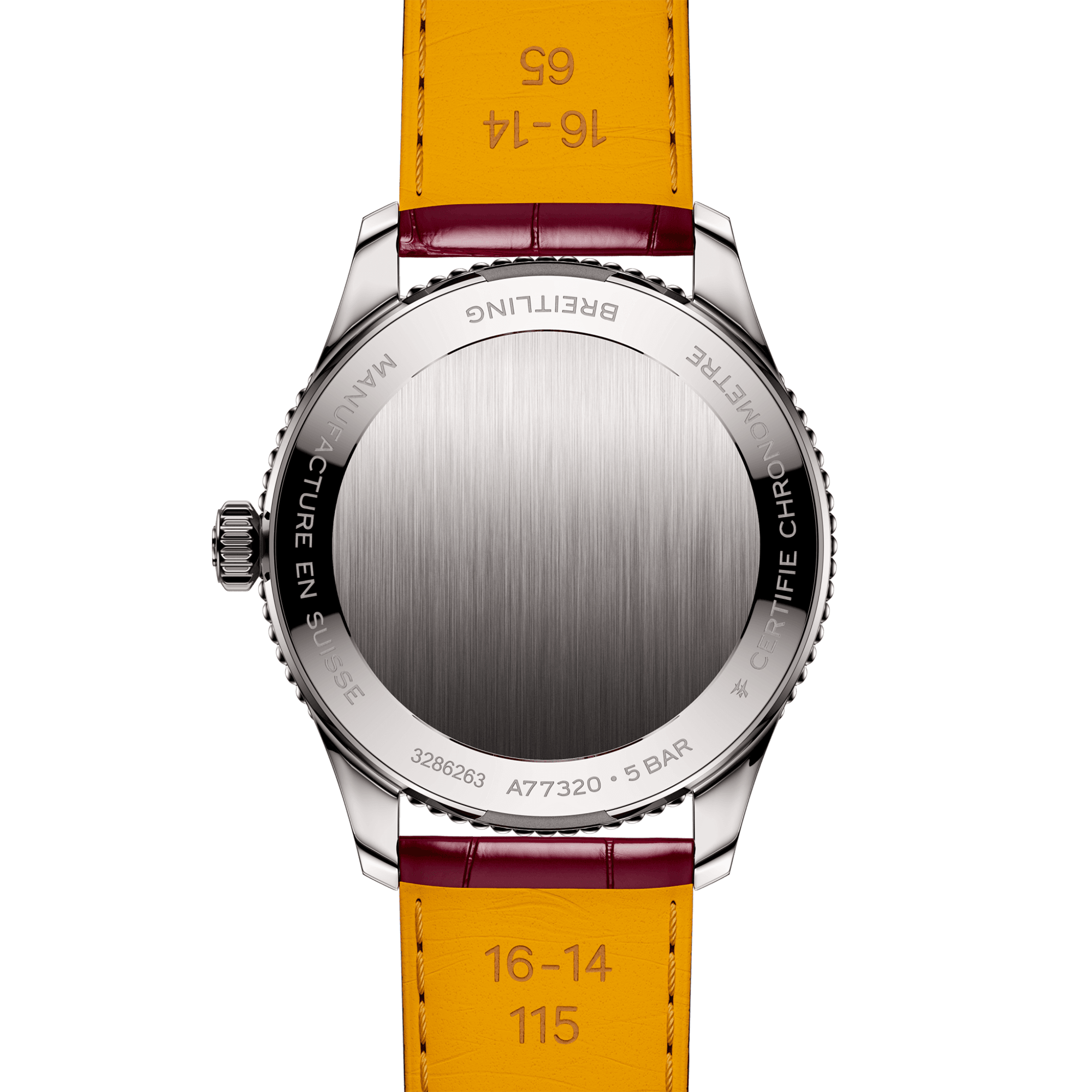 Breitling Navitimer 32mm White Mother of Pearl Diamond Dial Strap Watch A77320E61A2P2. Stainless steel 32mm case and bezel all on a red leather strap. This ladies watch has a white mother of pearl dial with rose golden hands and 12 diamond hour markers, red tipped seconds hand. Sapphire crystal glass and water resistant up to 50m. SuperQuartz movement.