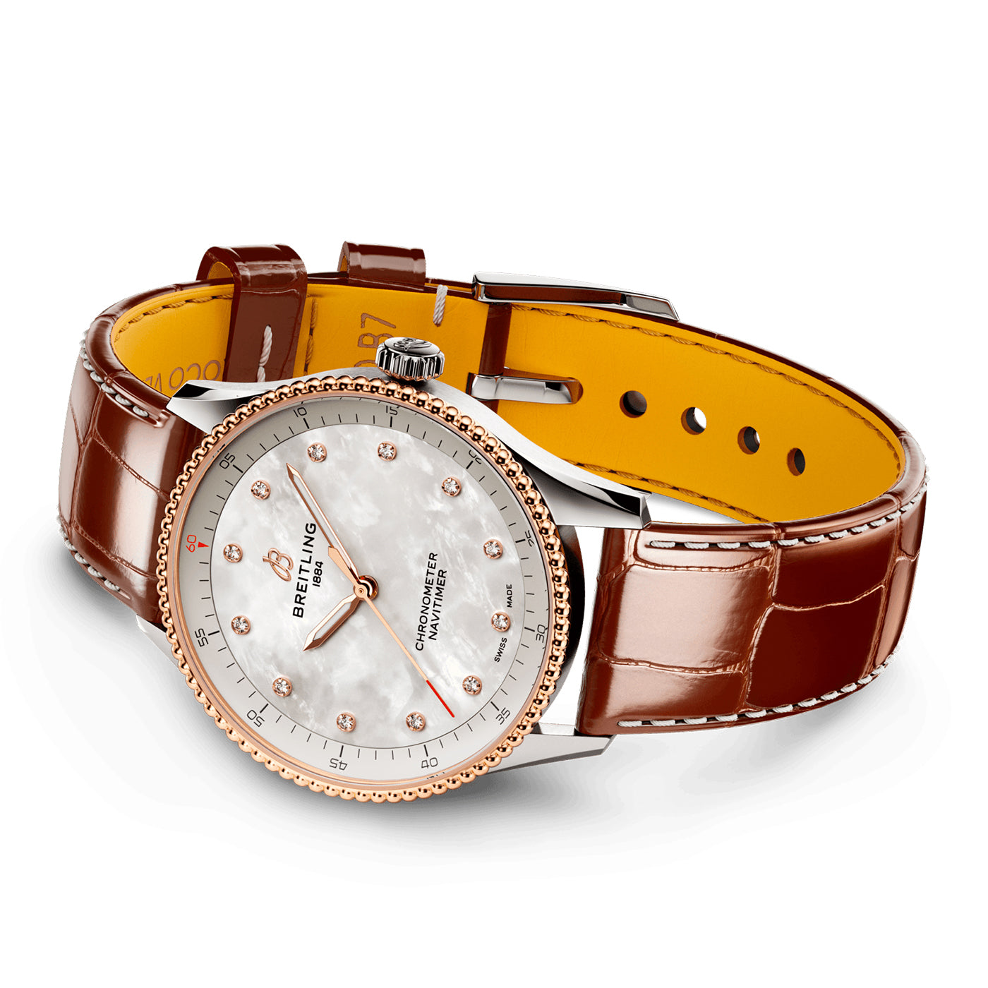 Breitling Navitimer 32mm Two-Tone Diamond Dial Ladies Strap Watch U77320E61A1P1. Stainless steel & 18ct red gold 32mm case and bezel all on a brown leather strap. This ladies watch has a white mother of pearl dial with rose golden hands and 12 diamond set hour markers, red tipped seconds hand. Sapphire crystal glass and water resistant up to 50m. Quartz movement.
