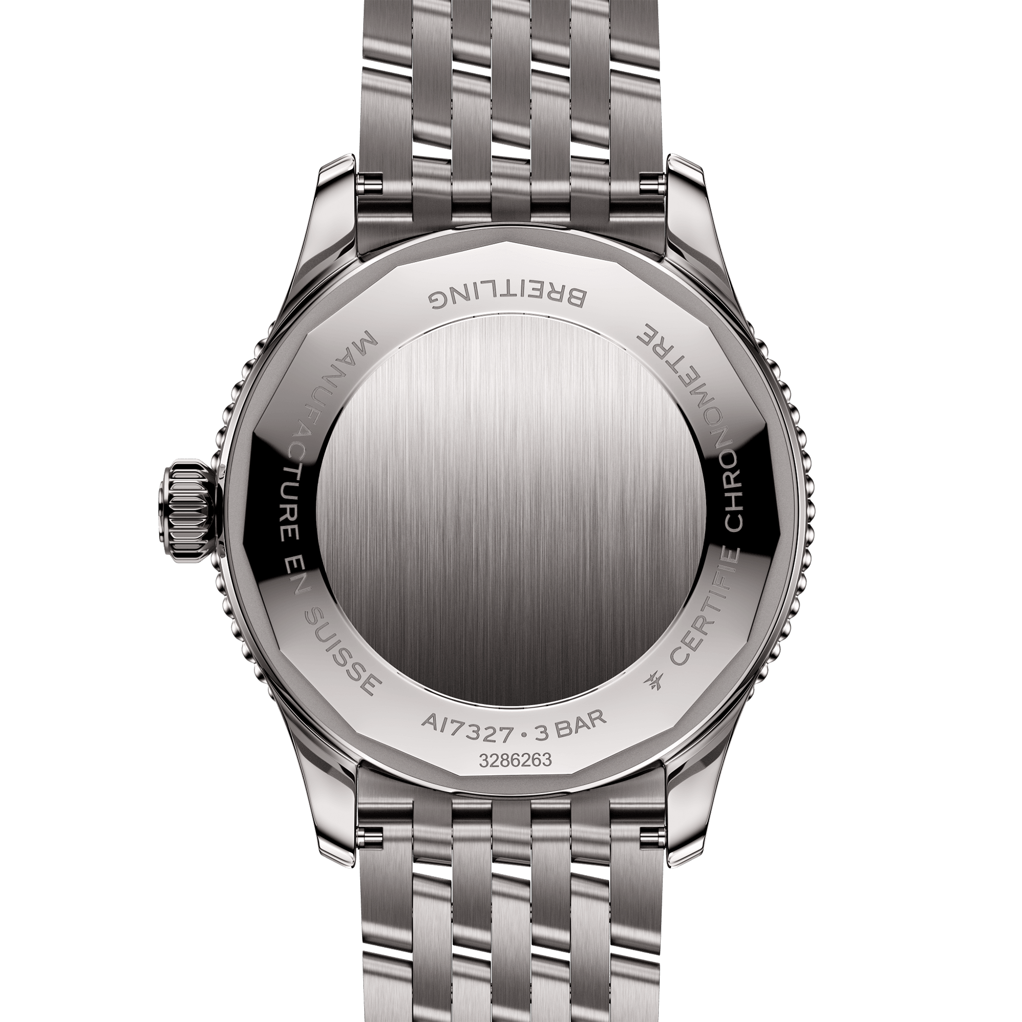 Breitling Navitimer 36mm Mint Green Dial Ladies Bracelet Watch A17327361L1A1. Stainless steel 36mm case and bezel all on a stainless steel bracelet. This ladies watch has a mint green sunray dial with polished hands and hour markers, red tipped seconds hand. Sapphire crystal glass and water resistant up to 30m. Power reserve up to 38 hours. Automatic movement.