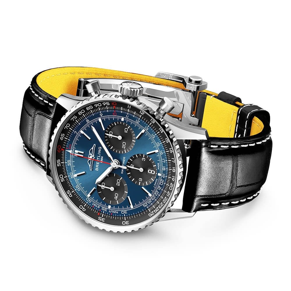 BreitlingNavitimer 41mm Blue/Black Dial Men's Chronograph Watch AB0139241C1P1. Stainless steel 41mm case and bidirectional bezel. This men's watch has an blue dial with polished hands and hour markers, contrasting black sub dials and a date display at the 6 o'clock position. Water resistant up to 30m and sapphire crystal glass. Power reserve up to 70 hours. Breitling 01 calibre automatic chronograph movement.