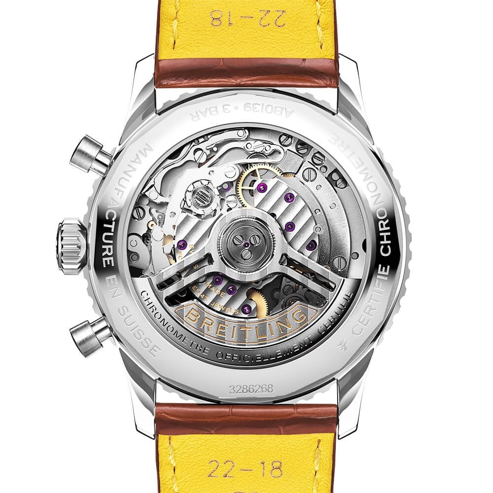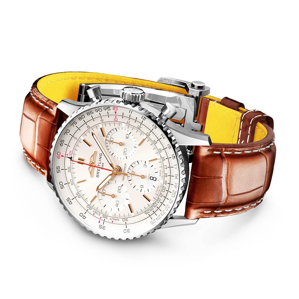 BreitlingNavitimer 41mm Silver/Gold Dial Men's Chronograph Watch AB0139211G1P1. Stainless steel 41mm case and bidirectional bezel. This men's watch has a silver dial with golden hands and hour markers and a date display at the 6 o'clock position. Water resistant up to 30m and sapphire crystal glass. Power reserve up to 70 hours. Breitling 01 calibre automatic chronograph movement.