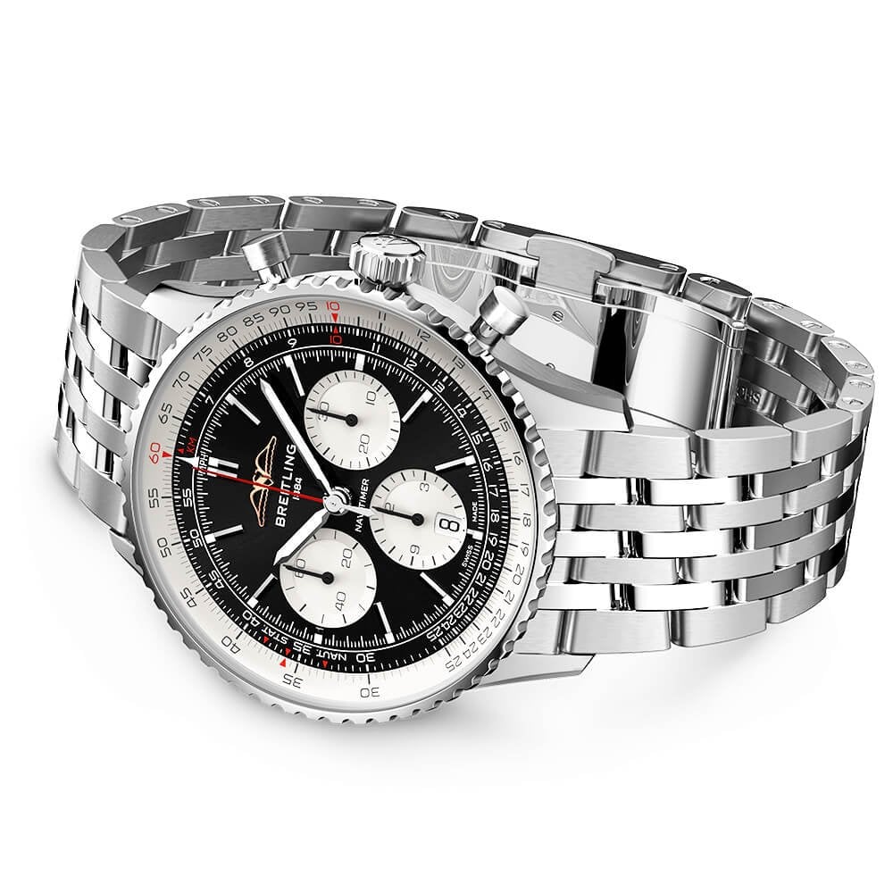 BreitlingNavitimer 43mm Black/Silver Dial Men's Automatic Chronograph Watch AB0138211B1A1. Stainless steel 43mm case and bidirectional bezel. This men's watch has a black dial with polished hands and hour markers, contrasting silver sub dials and a date display at the 6 o'clock position. Water resistant up to 30m and sapphire crystal glass. Power reserve up to 70 hours. Breitling 01 calibre automatic chronograph movement.