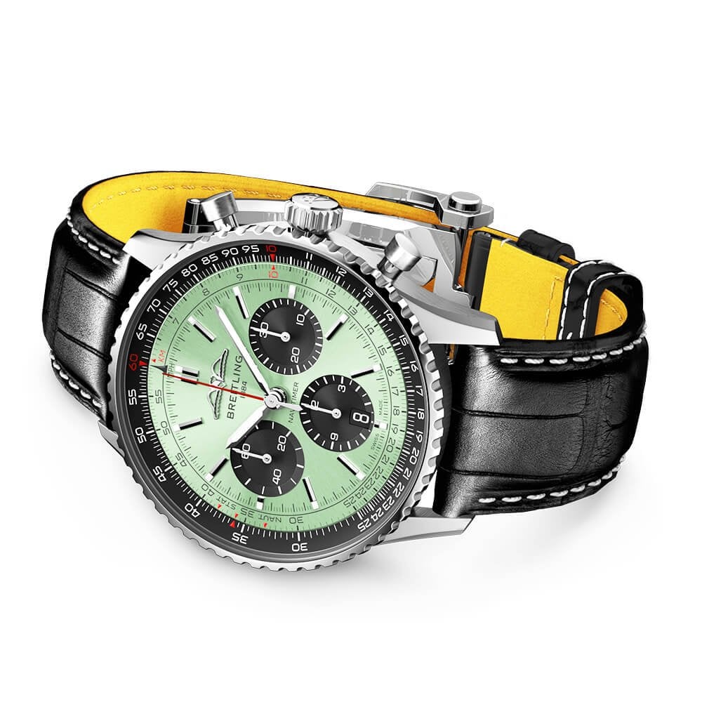 BreitlingNavitimer 43mm Mint Green/Black Dial Men's Chronograph Watch AB0138241L1P1. Stainless steel 43mm case and bidirectional bezel. This men's watch has a mint green dial with polished hands and hour markers, contrasting black sub dials and a date display at the 6 o'clock position. Water resistant up to 30m and sapphire crystal glass. Power reserve up to 70 hours. Breitling 01 calibre automatic chronograph movement.