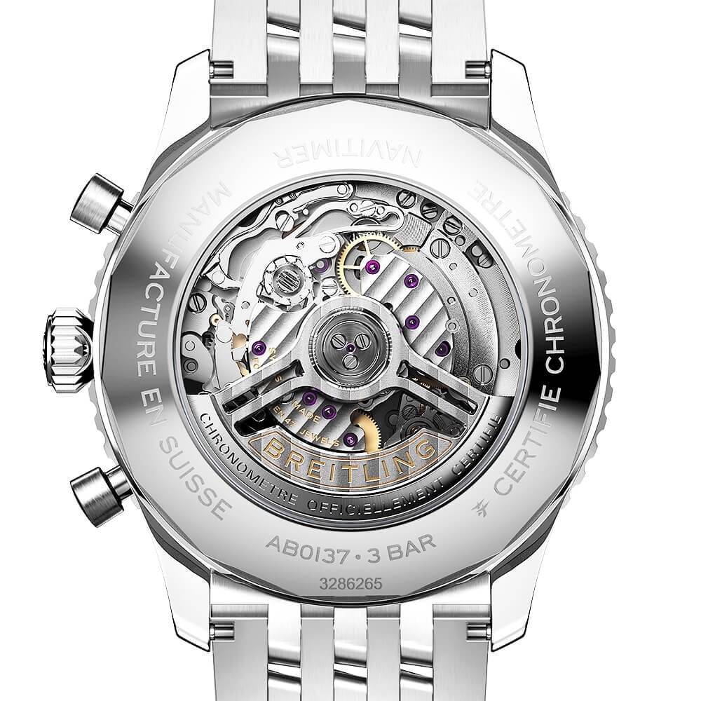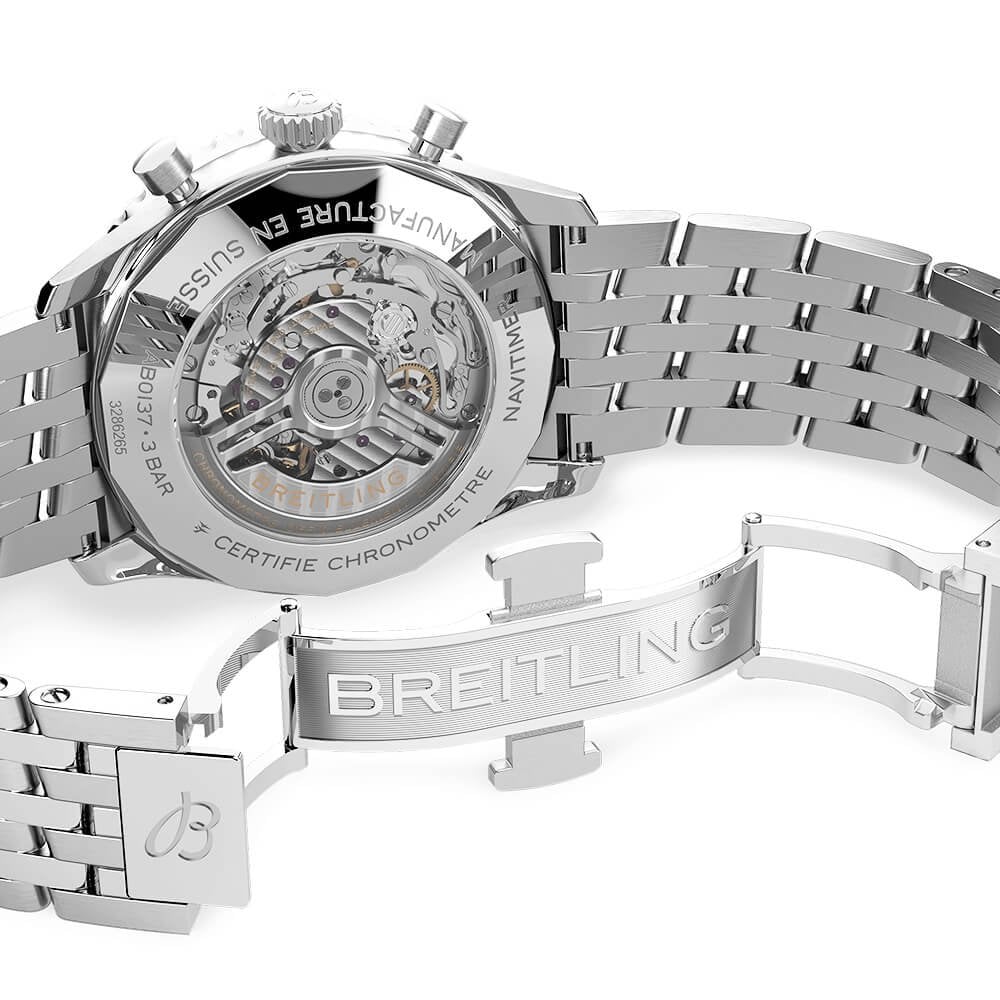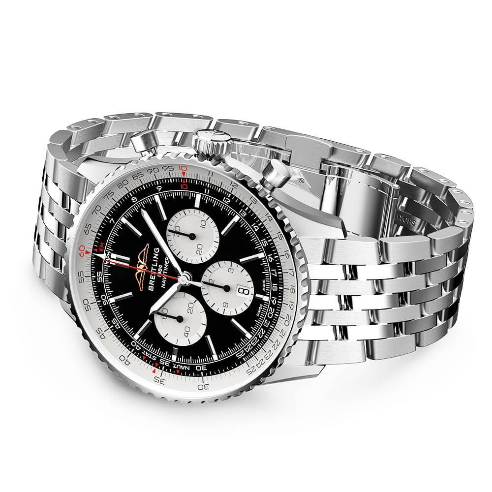 BreitlingNavitimer 46mm Black/Silver Dial Men's Automatic Chronograph Watch AB0137211B1A1. Stainless steel 46mm case and bidirectional bezel. This men's watch has a black dial with polished hands and hour markers, contrasting silver sub dials and a date display at the 6 o'clock position. Water resistant up to 30m and sapphire crystal glass. Power reserve up to 70 hours. Breitling 01 calibre automatic chronograph movement.
