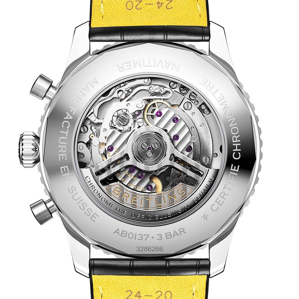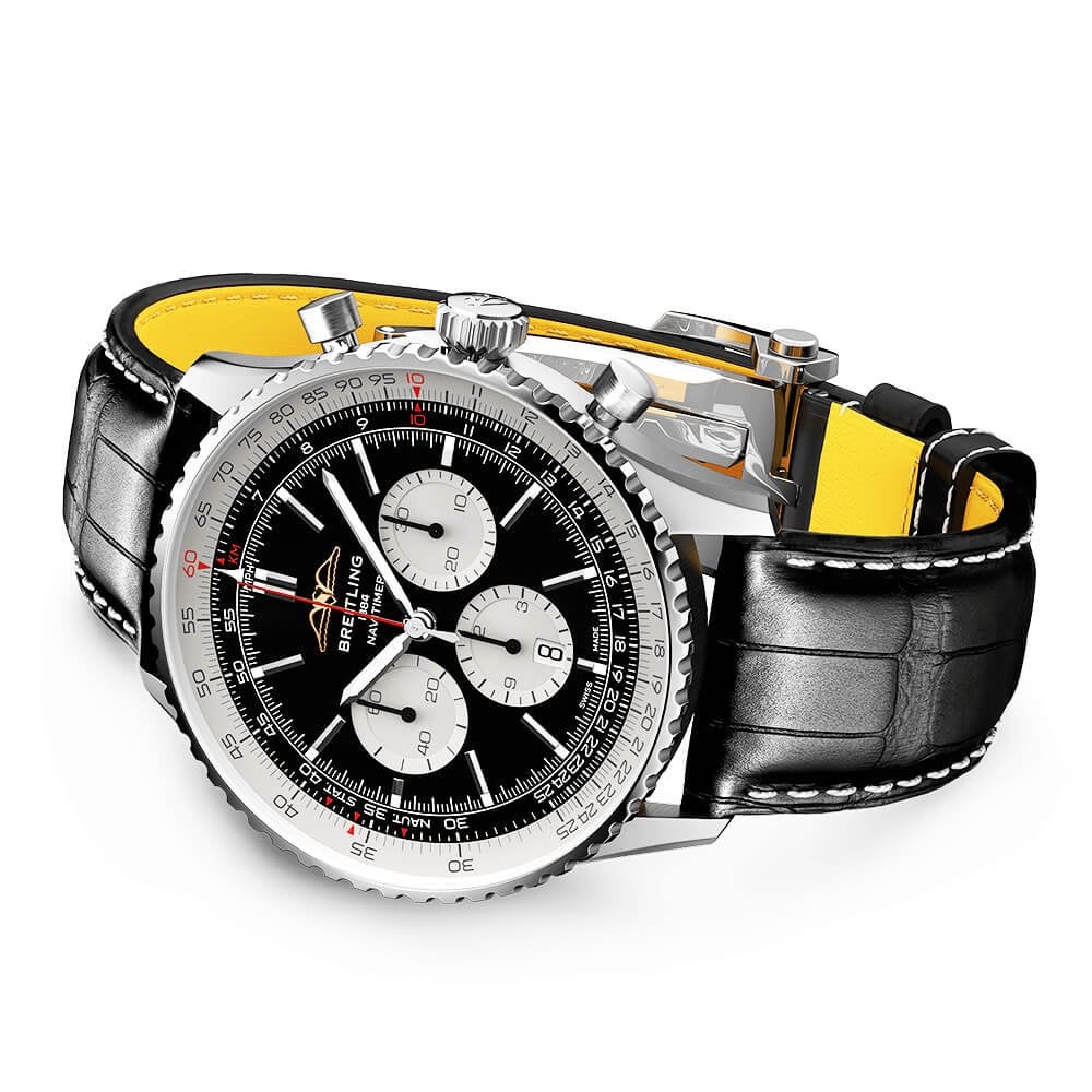 BreitlingNavitimer 46mm Black/Silver Dial Men's Chronograph WatchAB0137211B1. Stainless steel 46mm case and bidirectional bezel. This men's watch has a black dial with polished hands and hour markers, contrasting silver sub dials and a date display at the 6 o'clock position. Water resistant up to 30m and sapphire crystal glass. Power reserve up to 70 hours. Breitling 01 calibre automatic chronograph movement.
