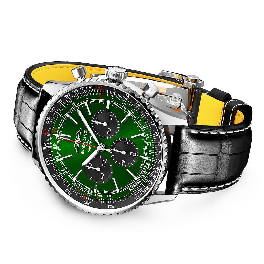BreitlingNavitimer 46mm Green/Black Dial Men's Chronograph Watch AB0137241L1P1. Stainless steel 46mm case and bidirectional bezel. This men's watch has a deep green dial with polished hands and hour markers, contrasting black sub dials and a date display at the 6 o'clock position. Water resistant up to 30m and sapphire crystal glass. Power reserve up to 70 hours. Breitling 01 calibre automatic chronograph movement.