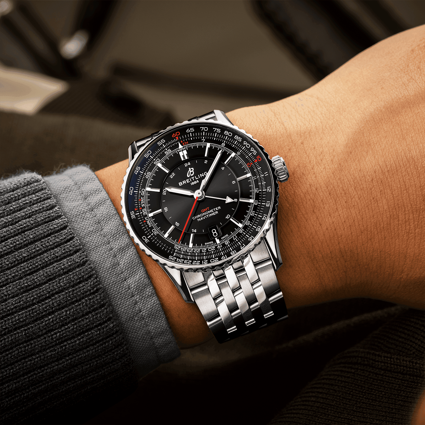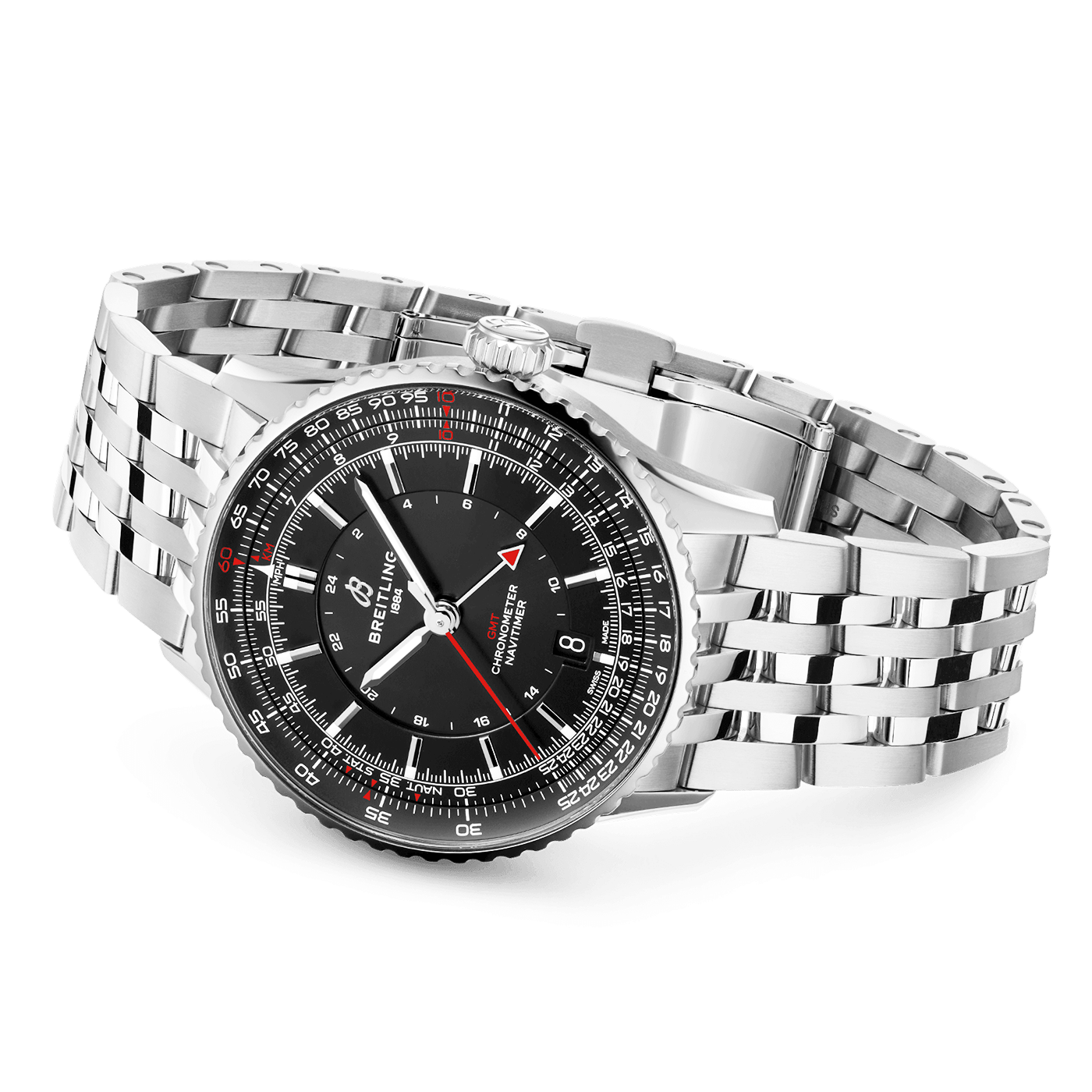 Breitling Navitimer GMT 41mm Black Dial Men's Automatic Bracelet Watch A32310251B1A1. Stainless steel 41mm case and bezel all on a stainless steel bracelet. This men's watch has a black dial with polished hands and hour markers, date display at the 6 o'clock position, red GMT hand. Sapphire crystal glass and water resistant up to 30m. Power reserve up to 42 hours. Automatic movement.