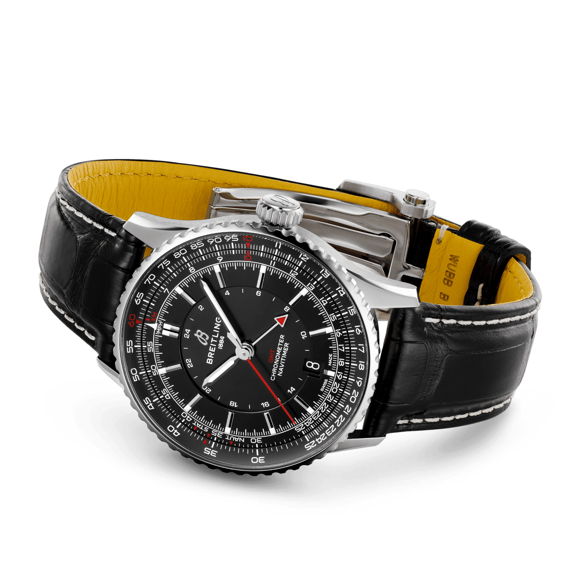Breitling Navitimer GMT 41mm Black Dial Men's Automatic Strap Watch A32310251B1P1. Stainless steel 41mm case and bezel all on a black leather strap. This men's watch has a black dial with polished hands and hour markers, date display at the 6 o'clock position, red GMT hand. Sapphire crystal glass and water resistant up to 30m. Power reserve up to 42 hours. Automatic movement.