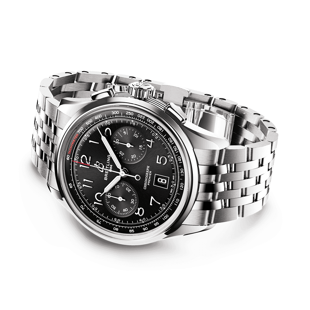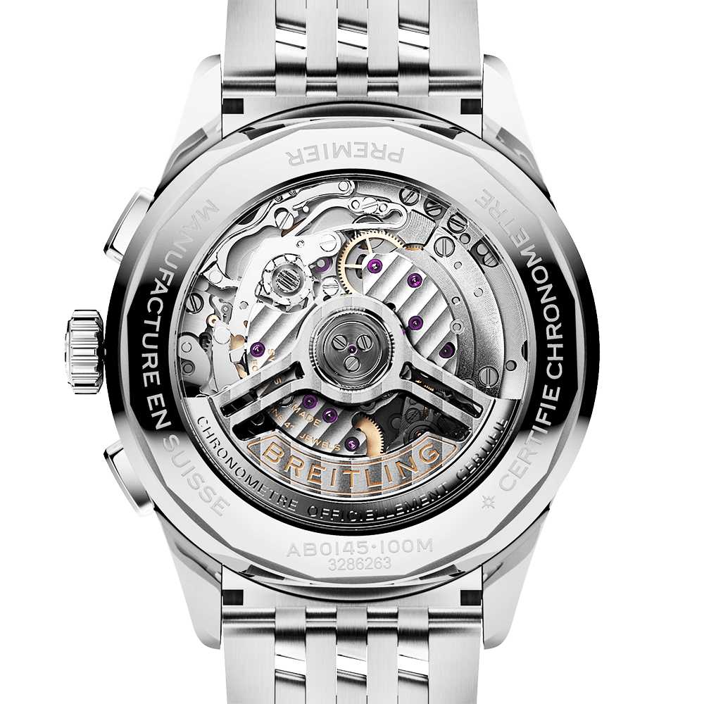 BreitlingPremier B01 42mm Black Sunray Dial Automatic Chronograph Watch AB0145221B1A1. Stainless steel 42mm case and bezel all on a matching stainless steel bracelet. This men's watch has a sunray blackdial with polished hands and hour markers, date display at the 6 o'clock position. Water resistant up to 100m and sapphire crystal glass. Power reserve up to 70 hours. Automatic chronograph movement.