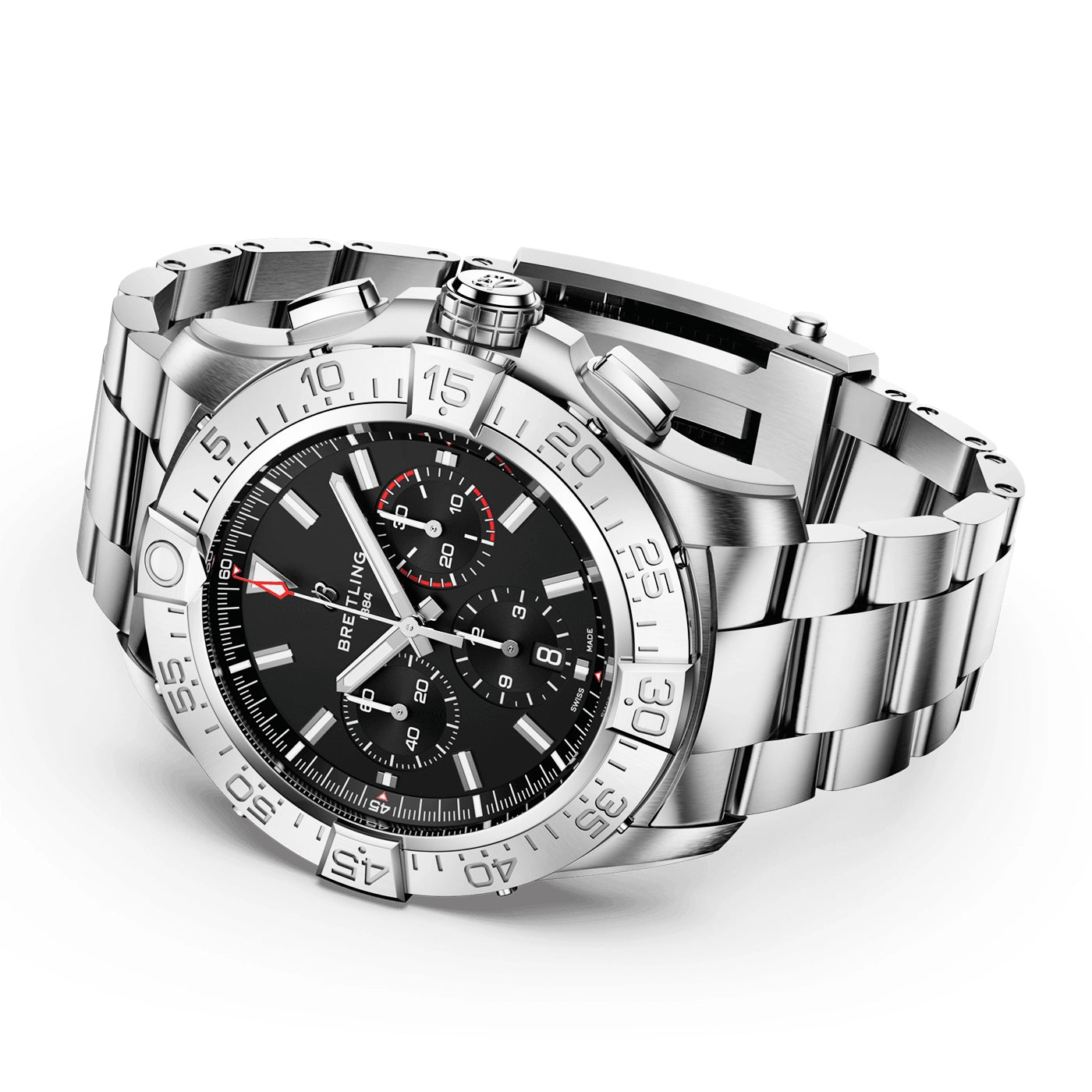 Breitling Super Avenger Chronograph 46mm Titanium Black Dial Bracelet Watch EB0148101B1E1. Titanium 46mm case and bezel all on a titanium bracelet. This men's watch has a black dial with luminous applied hands and hour indexes, date display at the 6 o'clock position. Water resistant up to 300m and sapphire crystal glass. Power reserve up to 70 hours. Automatic chronograph movement.
