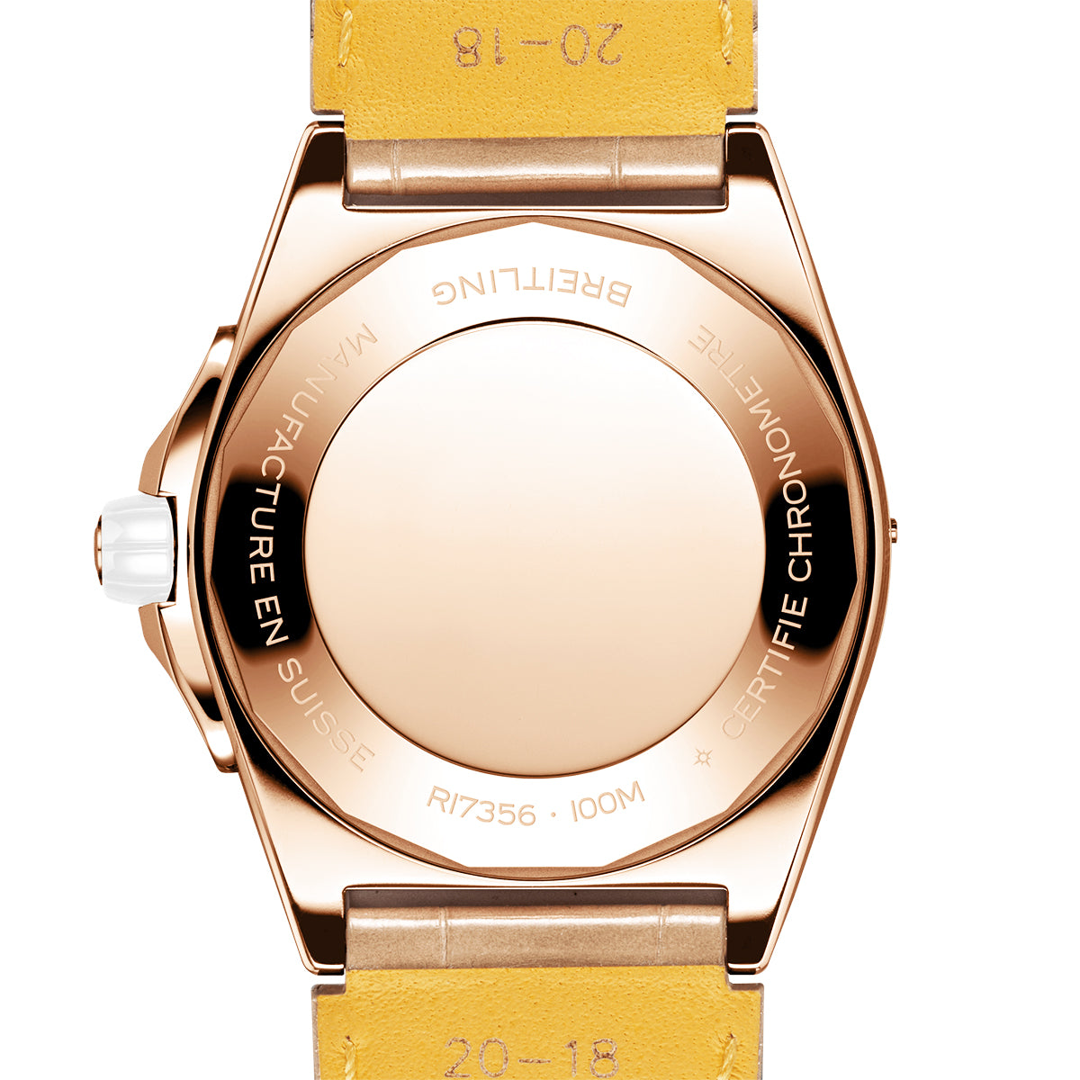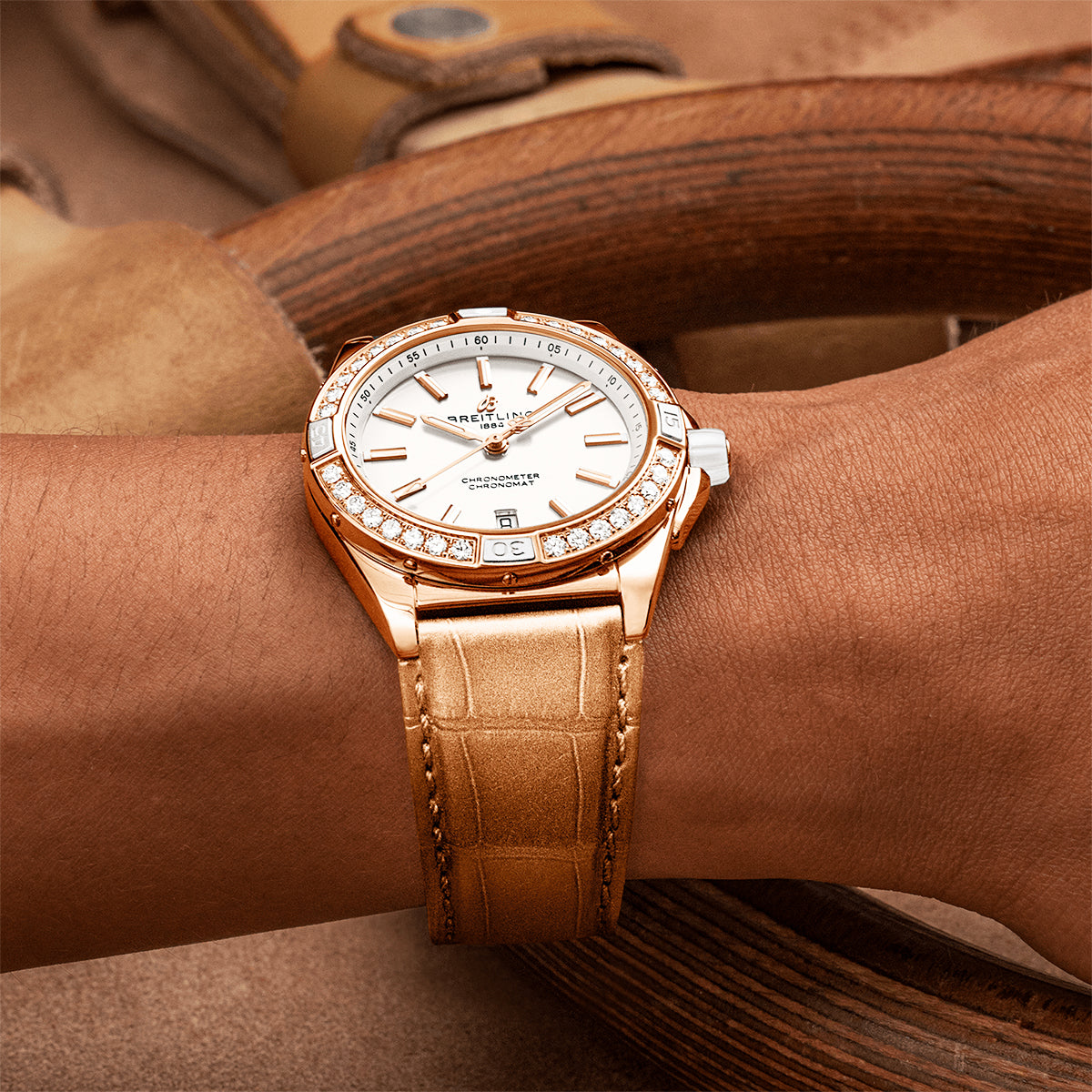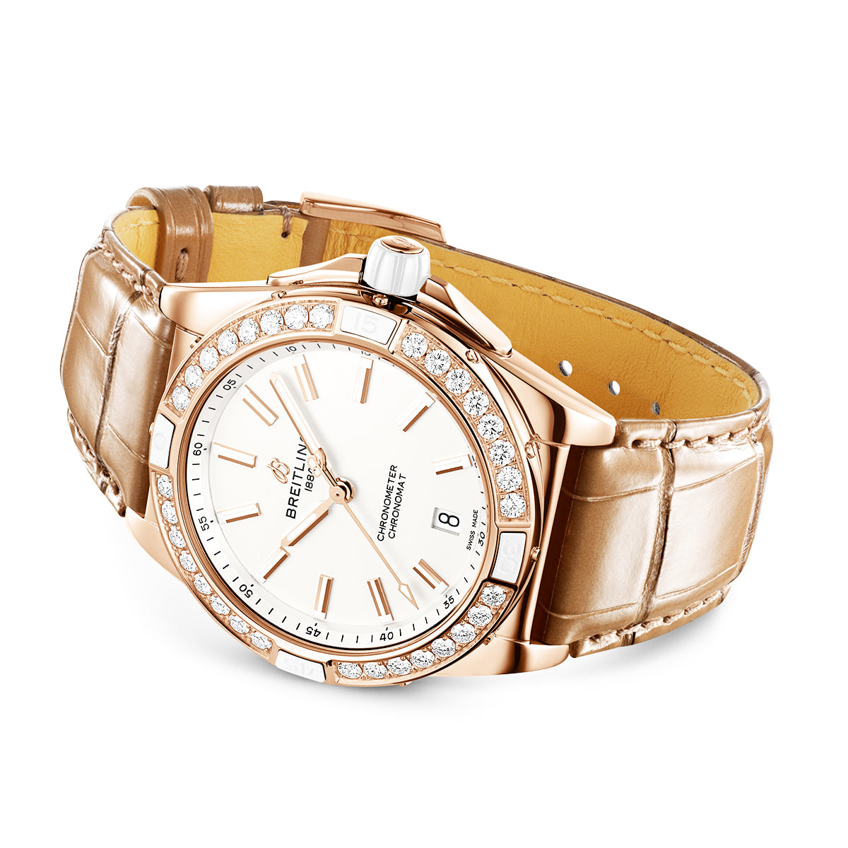 Breitling Super Chronomat 18ct Rose Gold 38mm Silver Dial Leather Strap Watch R17356531G1P1. 18ct red gold 38mm case and lab-grown diamond set bezel with 4 white ceramic rider tabs, all on a brown alligator leather strap. This watch has a silver dial with golden hands and hour indexes, date display at the 6 o'clock position. Sapphire crystal glass. Automatic movement.
