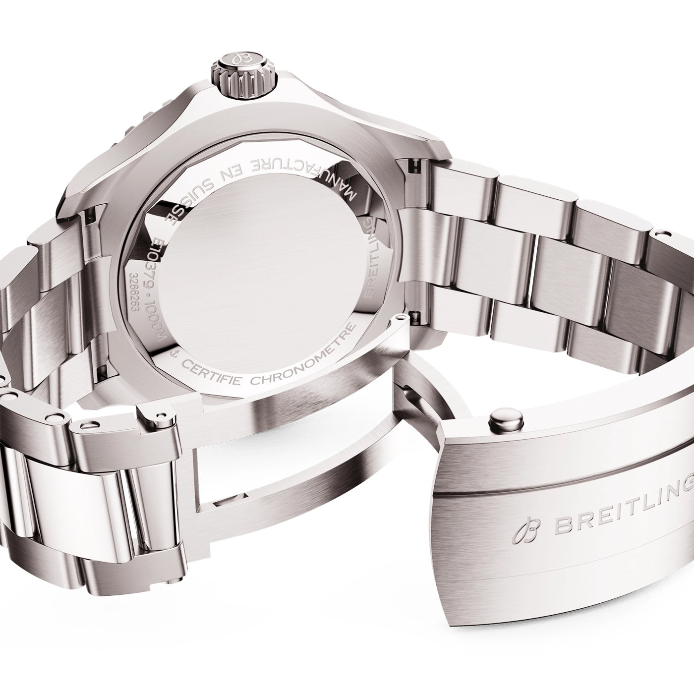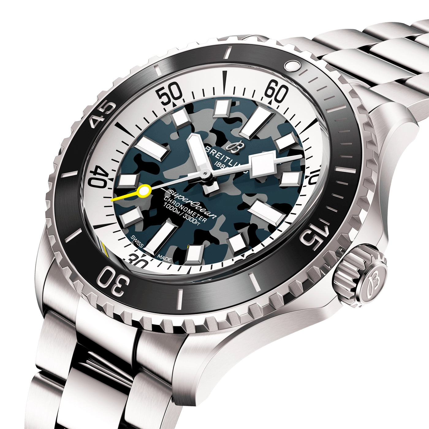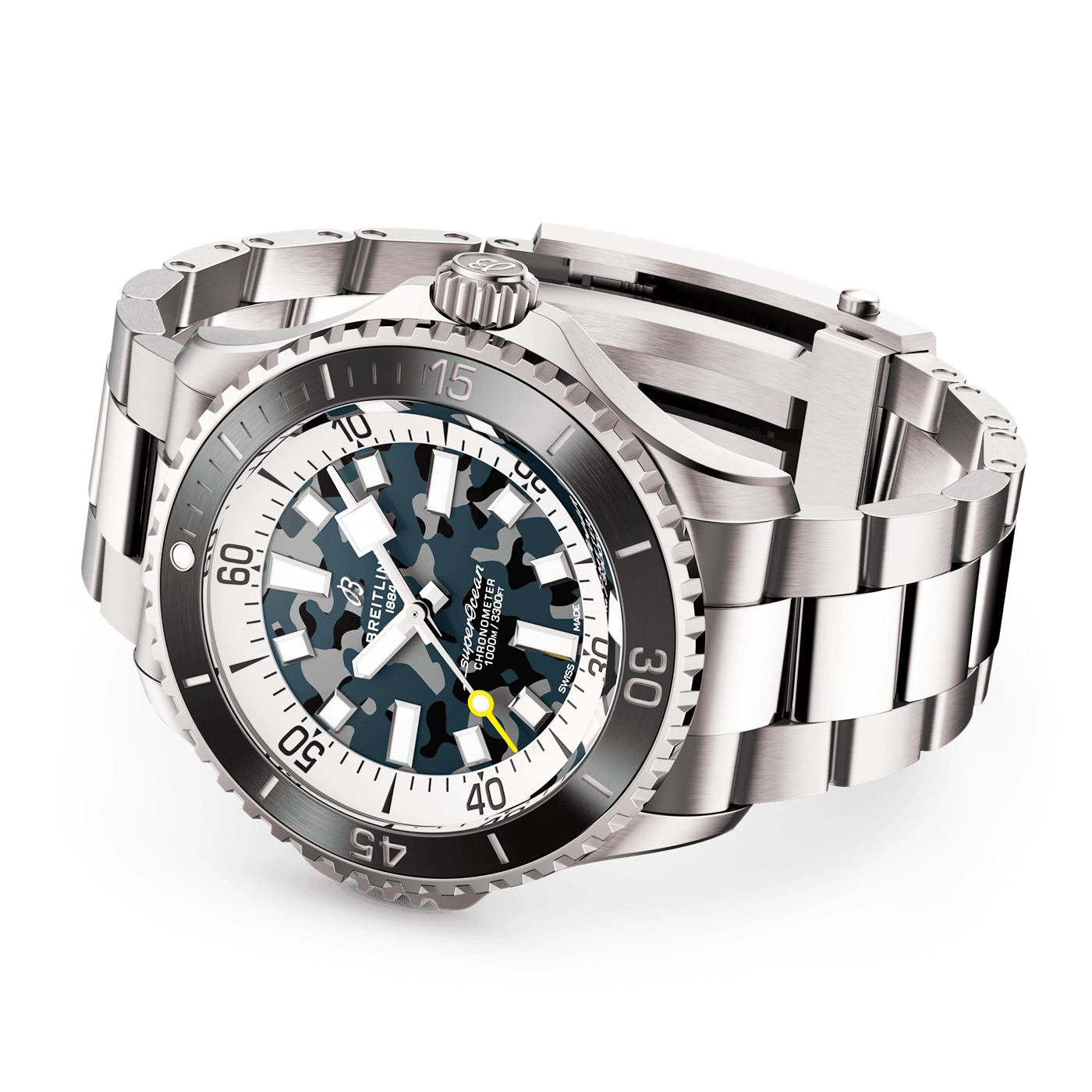 Breitling Superocean Super Diver 46mm Grey Camo Dial Bracelet Watch E10379351B1E1. Titanium 42mm case and black ceramic inlayed bezel all on a titanium bracelet. This men's watch has an anthracite camo dial with large silver outer ring, luminous applied hands and hour markers. Water resistant up to 300m and sapphire crystal glass. Automatic movement.